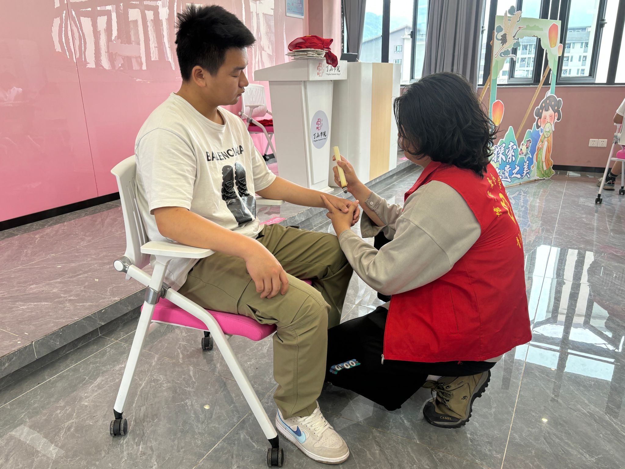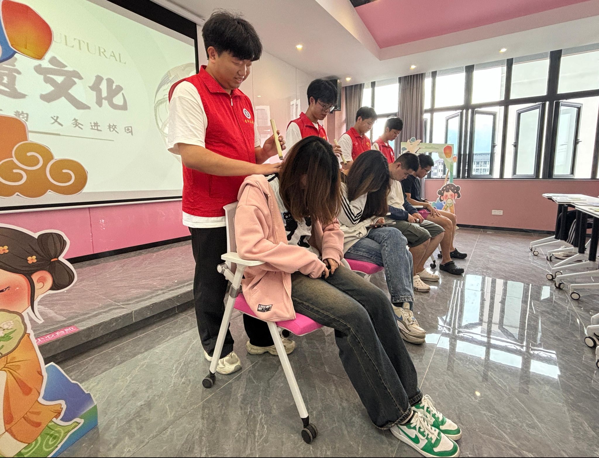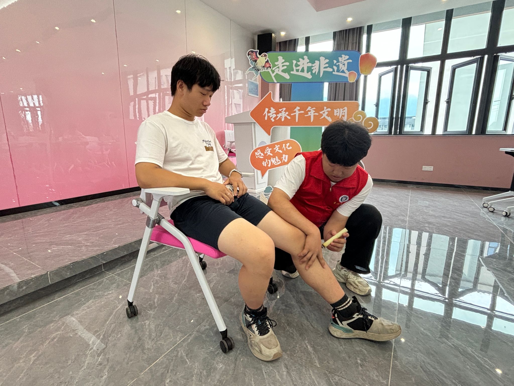 在教学环节,找准穴位是艾灸的关键。工作人员细致地向同学们传授如何快速找到大椎、合谷、足三里这三个重要穴位的技巧。通过在工作人员的精准示范,以及一对一的现场指导,同学们逐渐掌握了穴位定位的方法。大家纷纷在自己身上或互相之间寻找穴位,认真的模样展现出对知识的渴望。与此同时,工作人员还着重强调了艾灸过程中的注意事项、艾灸的禁忌人群以及可能出现的应急情况处理办法。
