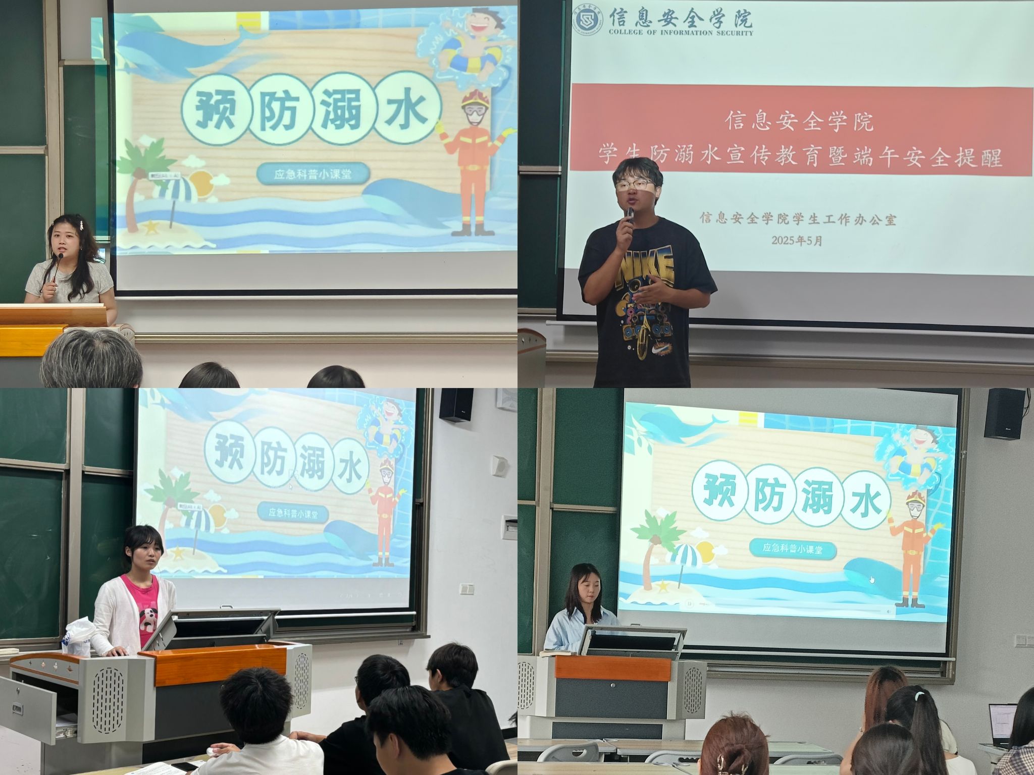 粽叶飘香,端午将至。为强化学生防溺水意识,信息安全学院特在端午假期前开展防溺水专项安全教育。各年级辅导员深入班级召开主题班会,通过播放真实溺水案例纪录片、组织“防溺水知识问答”,逐一向同学们标注水库、河流等事故高发地段的潜在风险。同时,辅导员们还通过班级群同步推送安全提醒短信,筑牢防溺水安全防线。