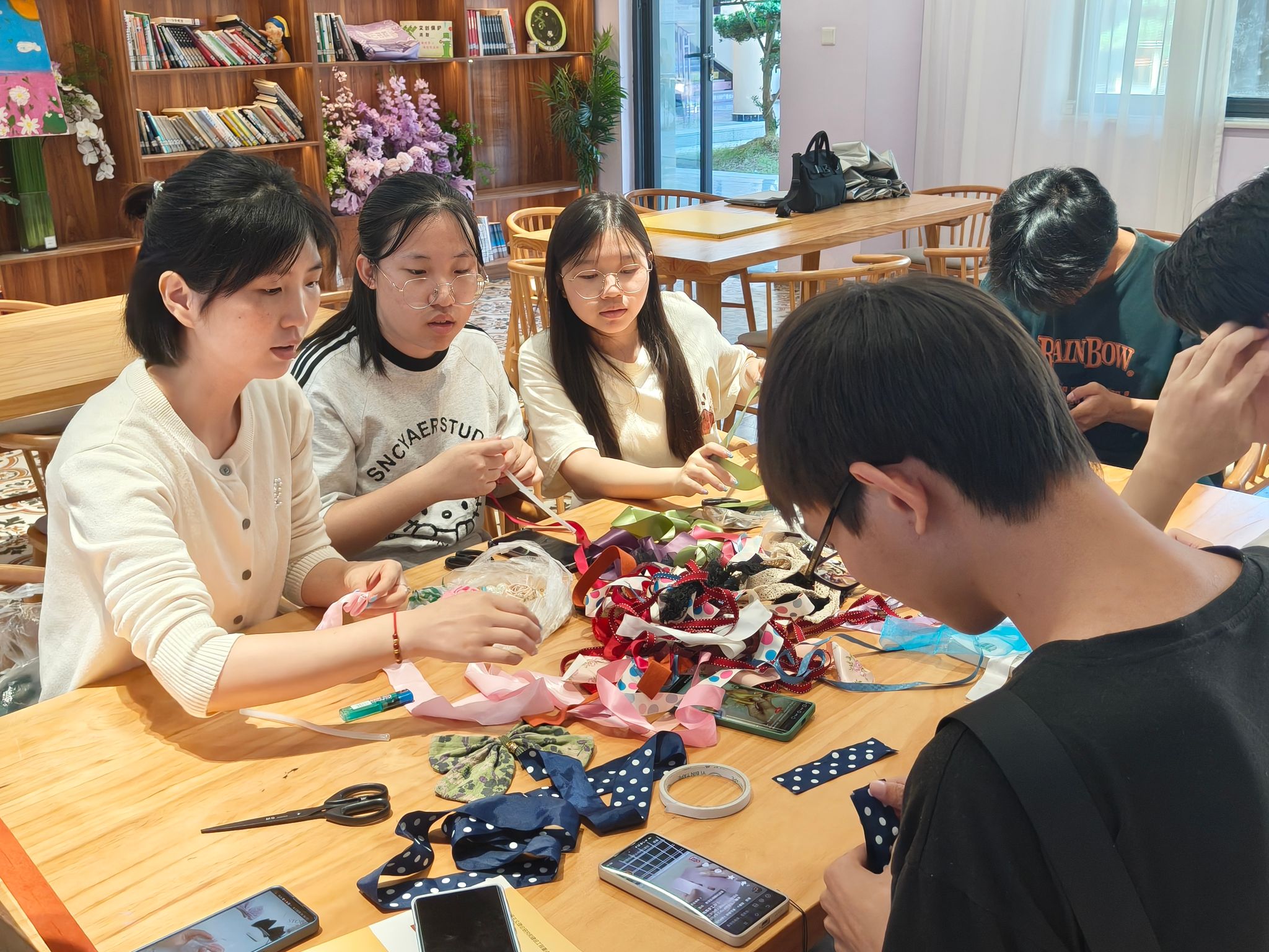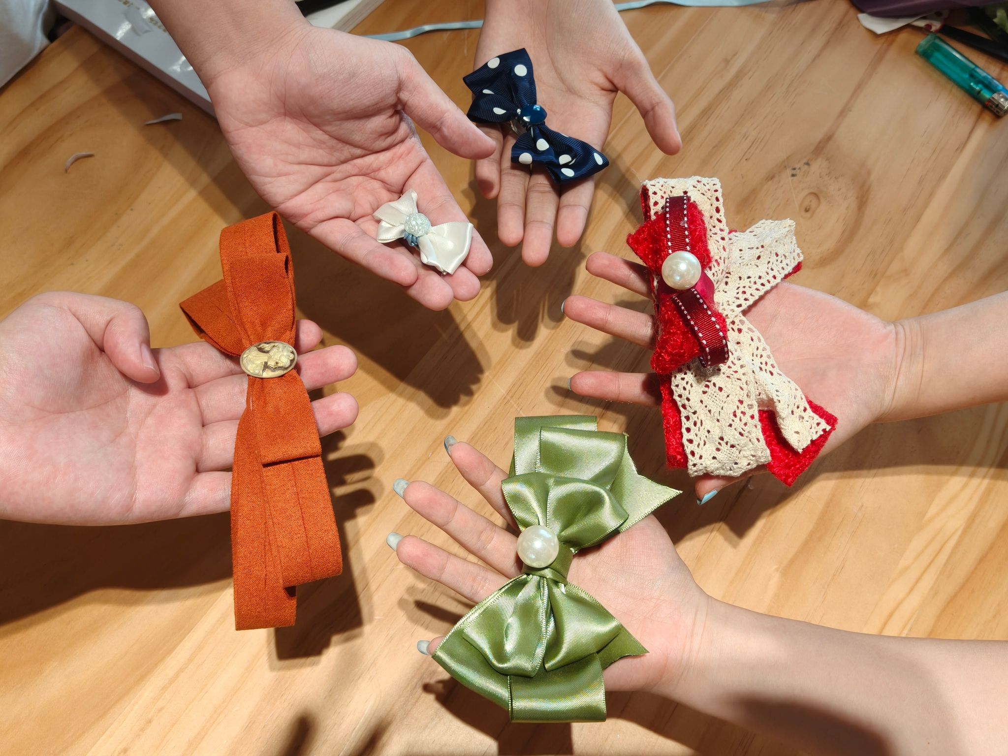 随后,同学们纷纷动手制作起来。大家充分发挥自己的创意和想象力,将不同颜色、不同材质的丝带巧妙搭配,制作出了一个个造型各异、精美绝伦的蝴蝶结。有的同学制作了简约大方的单层蝴蝶结,有的同学则制作了华丽复杂的多层蝴蝶结,还有的同学在蝴蝶结上添加了珍珠、亮片等装饰品,让蝴蝶结更加闪耀夺目。