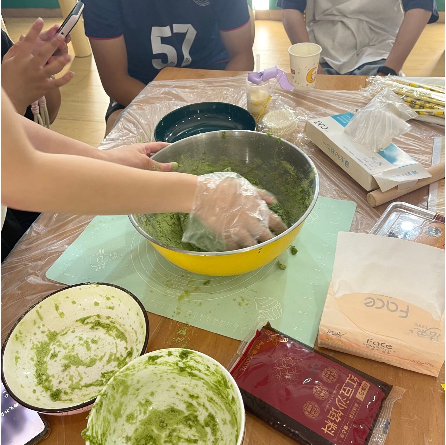 青团制作区同样热闹非凡。同学们将新鲜的艾草汁揉入糯米粉,包裹着香甜的豆沙馅,在灯光下显得格外翠绿诱人。"晚上做青团反而更有感觉,灯光下的颜色特别好看。"刘梦茹举起自己制作的青团,开心的说到。