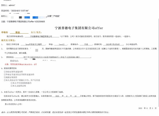2025年的夏季,我的努力终于结出了硕果。凭借扎实的技术能力和清晰的职业规划,我同时收到了京东方测试工程师岗位的正式offer,以及宁波一家科技公司的Java开发实习机会。站在签约现场,我深知,这些机会的背后,是双体“技术+职场”教育模式的精准赋能。