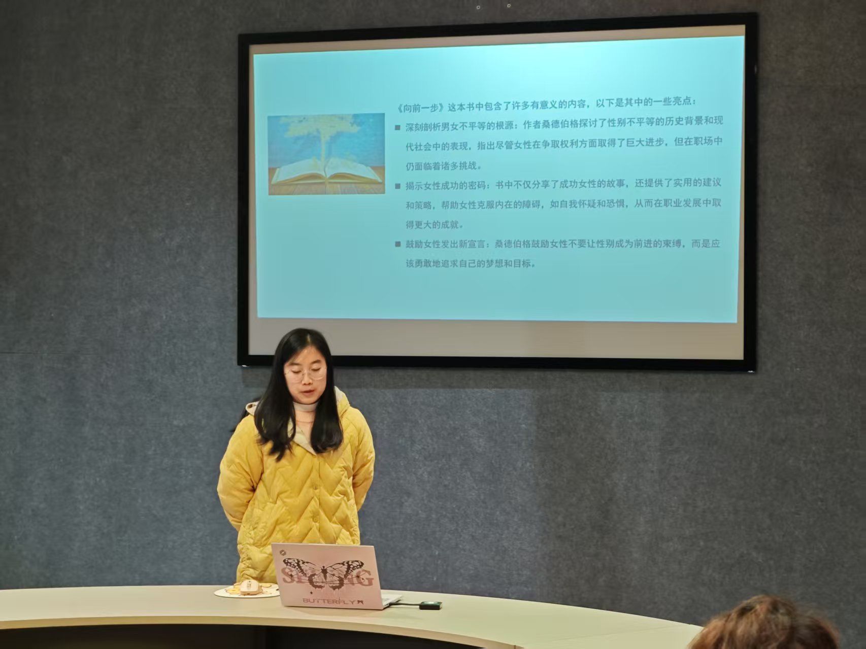 来自信息安全学院观云书院的田舒梅同学,则是通过她分享的书籍,鼓励我们要克服内心的恐惧,积极争取自己想要的东西。在生活和工作中,我们常常因为害怕失败而退缩,不敢表达自己的想法和观点。但正如书中《向前一步》所说,女性要敢于规划职业,不怕突发事件影响自己。我们应该勇敢地向前一步,抓住机会,展现自己的能力。桑德伯格鼓励女性“往桌前坐”,勇敢争取机会,而非被动等待。她强调“完成比完美重要”,提醒女性不必苛求100%的准备,而应边做边学,突破自我怀疑。书中还探讨了如何平衡事业与家庭,建议女性寻找支持自己的伴侣,并学会真诚沟通,建立更深层次的人际关系。