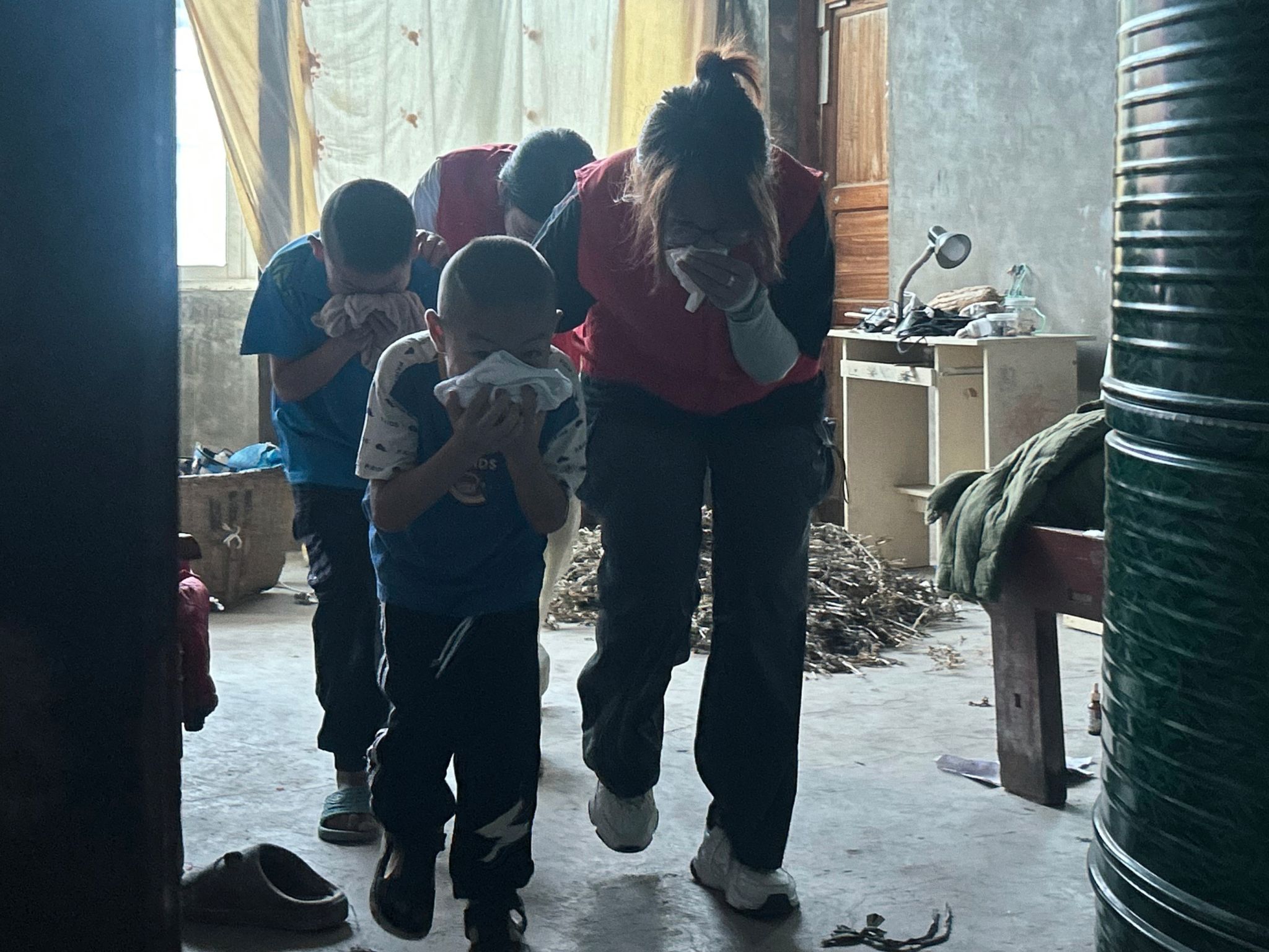 在村活动中心里,孩子们齐唱志愿者自编的消防儿歌。志愿者通过“电器着火如何处理”、“火灾来临时如何快速逃跑”等生活互动问题,结合“打滚灭火”、“湿巾捂鼻”等动作演示,让孩子们在实践中掌握消防安全知识与自我保护技能。