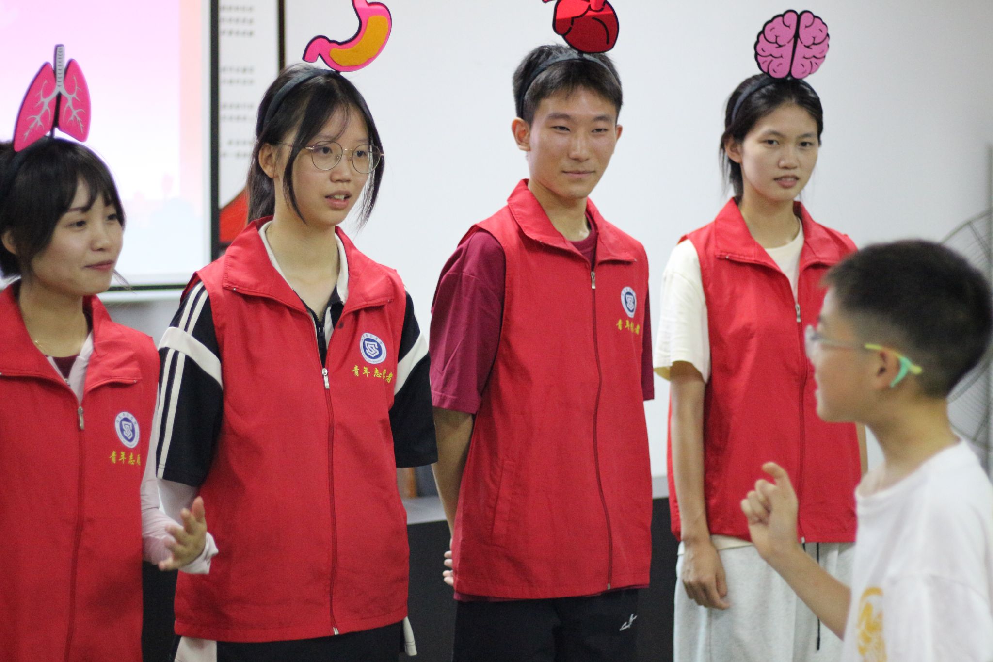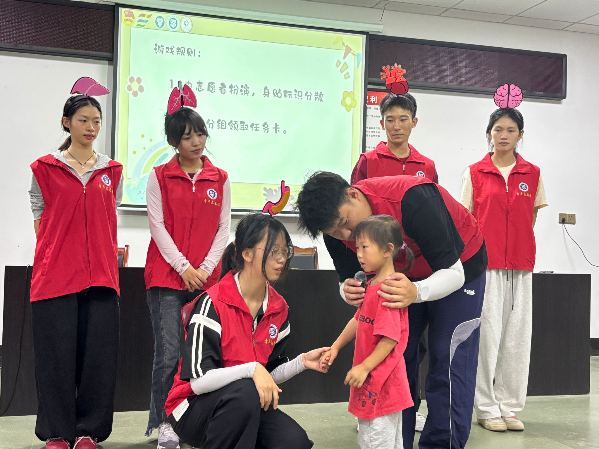 在“身体地图大解密”环节,志愿者身贴标识扮演“器官”,孩子们化身“器官寻宝者”,其中,有小朋友说“肺像会呼吸的小海绵,能帮我们把新鲜空气装进来!”这充满童趣的比喻不仅让小朋友直观认识了器官功能,也为他们的生命认知奠定了坚实基础。