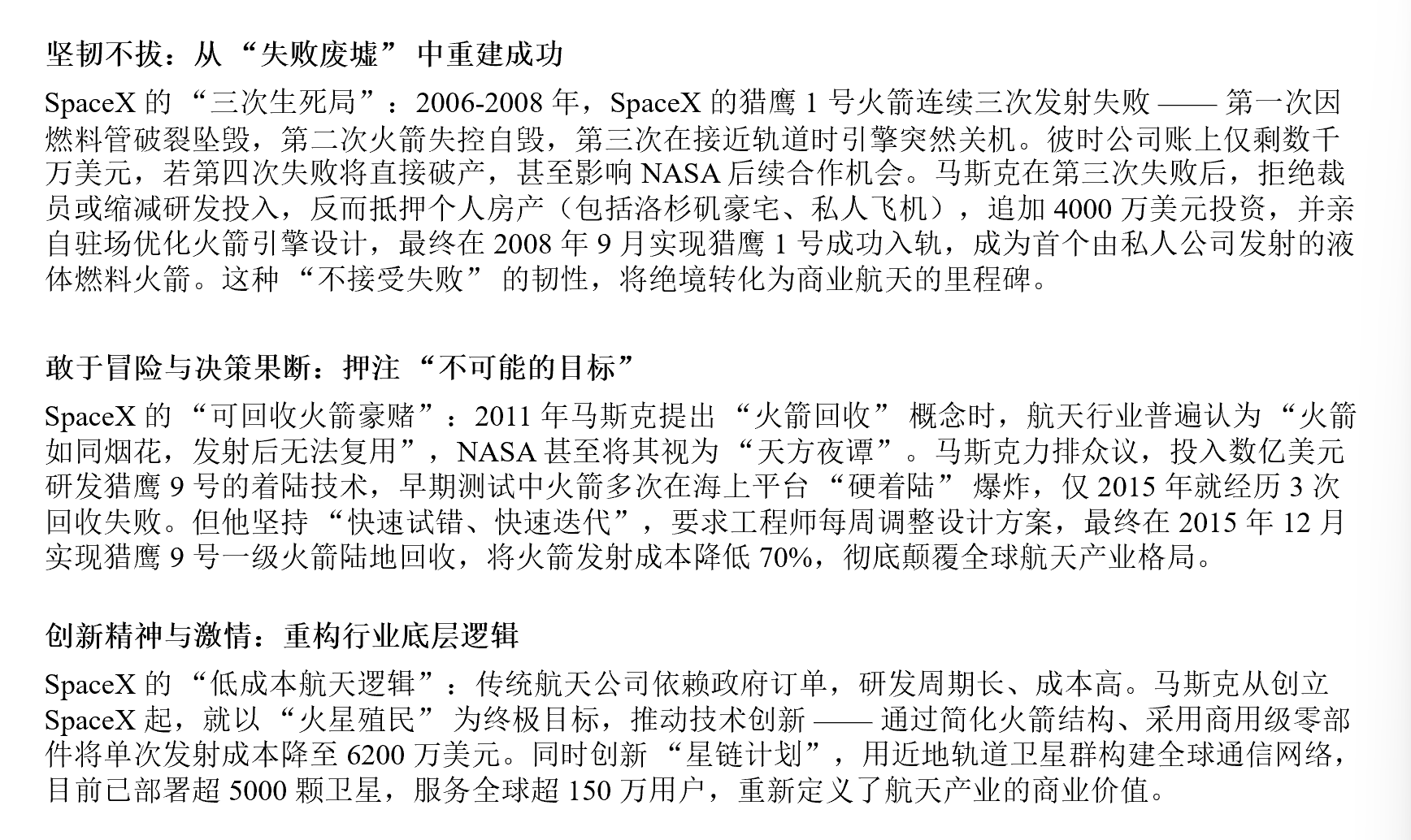 分享会上,主分享人汪同学通过生动的案例,详细介绍了马斯克的关键人生节点。在特斯拉濒临破产时,他抵押房产、投入全部资金,坚守电动汽车的梦想,最终让特斯拉成为全球电动汽车行业的领军者;SpaceX的前三次火箭发射均以失败告终,在资金链断裂的边缘,他力排众议进行第四次发射,终于实现火箭回收的壮举,开创了太空探索的新纪元。