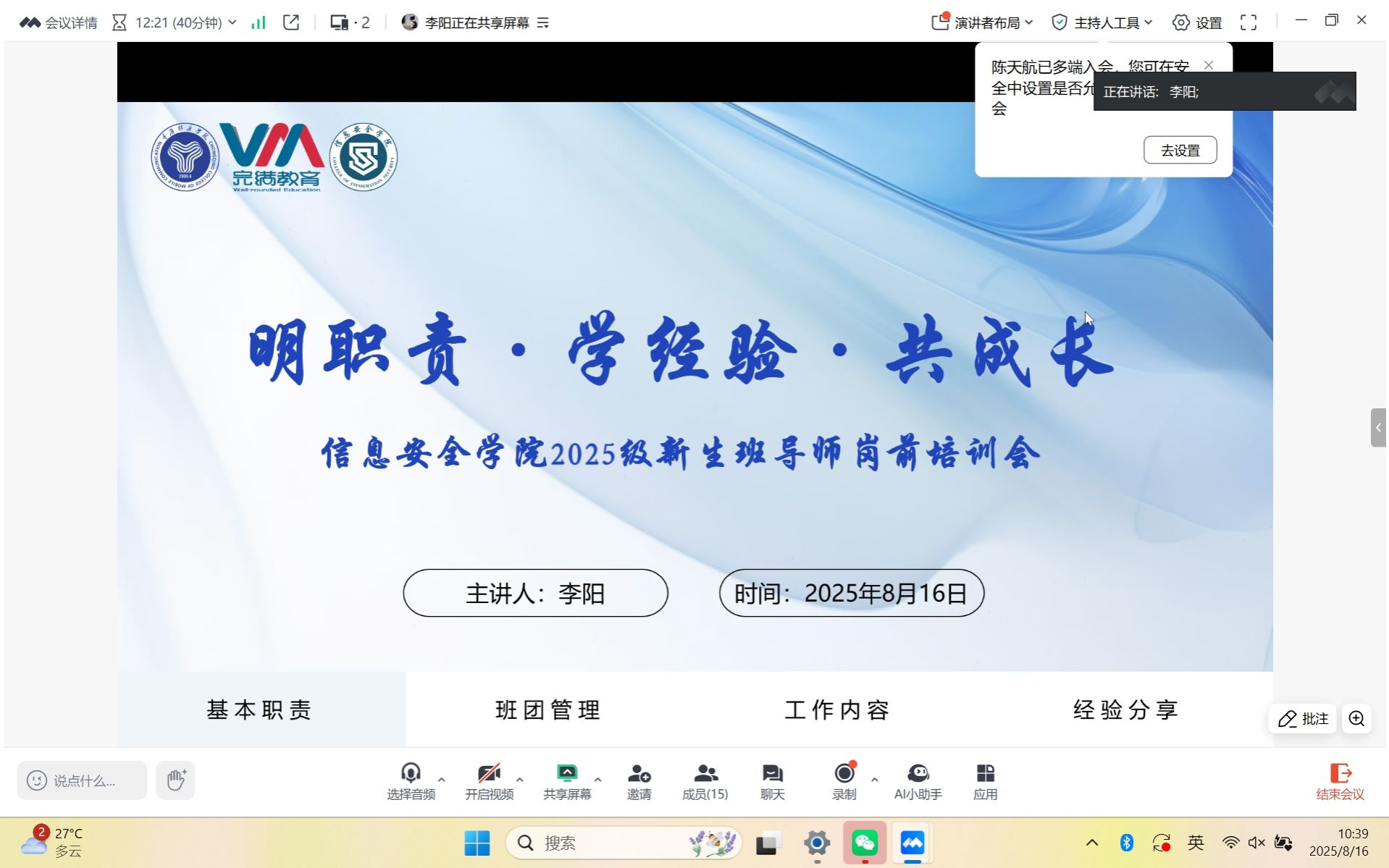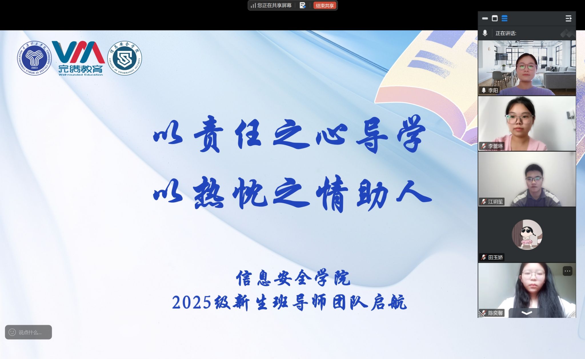 为切实赋能2025级新生的“引路人”,帮助新生班导师明确工作职责、掌握工作方法,8月16日10:30,信息安全学院以线上形式在腾讯会议平台开展“信息安全学院2025级新生班导师岗前培训会”。会议由辅导员李阳主持,2025级全体新生班导师参会。