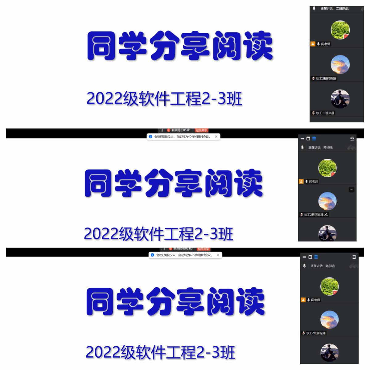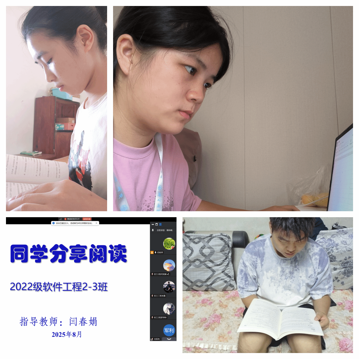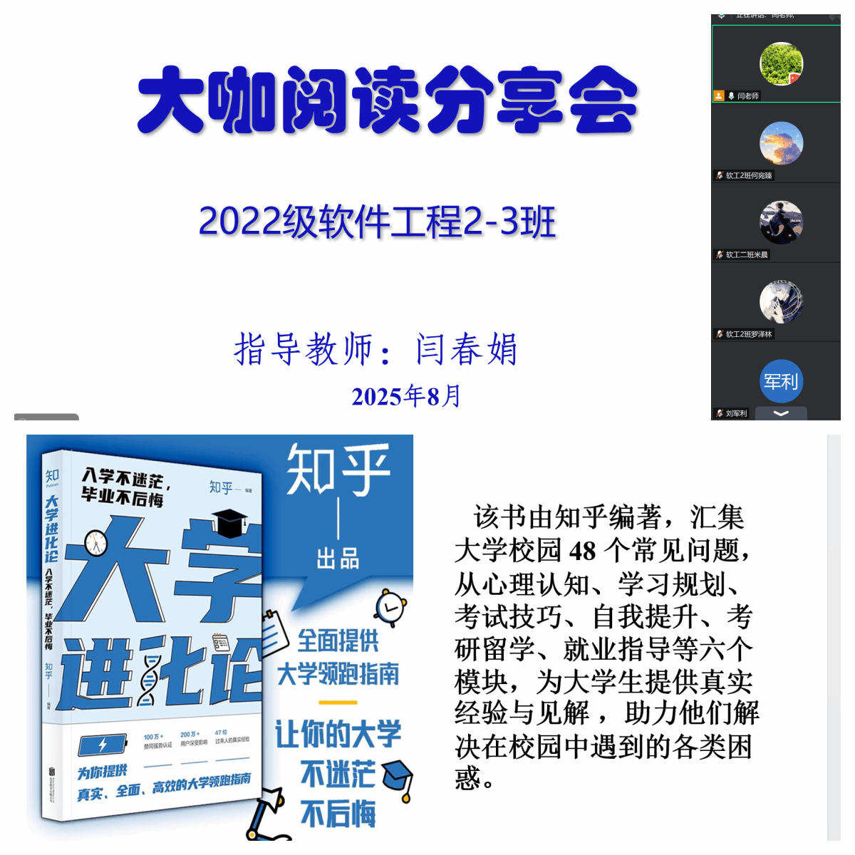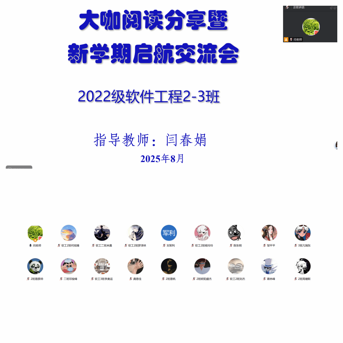 为破解大学生活困惑、锚定新学期成长目标,2025年8月24晚上,2022级软件工程2-3班部分同学在指导教师闫春娟的组织下,顺利举办暑假大咖阅读分享暨新学期启航线上交流会。同学们假期线上齐聚一堂,本次活动中,同学们围绕自己读的书籍谈感悟、结合自身情况聊计划,轻松热烈的交流氛围,为新学期的学习生活拉开了好序幕。