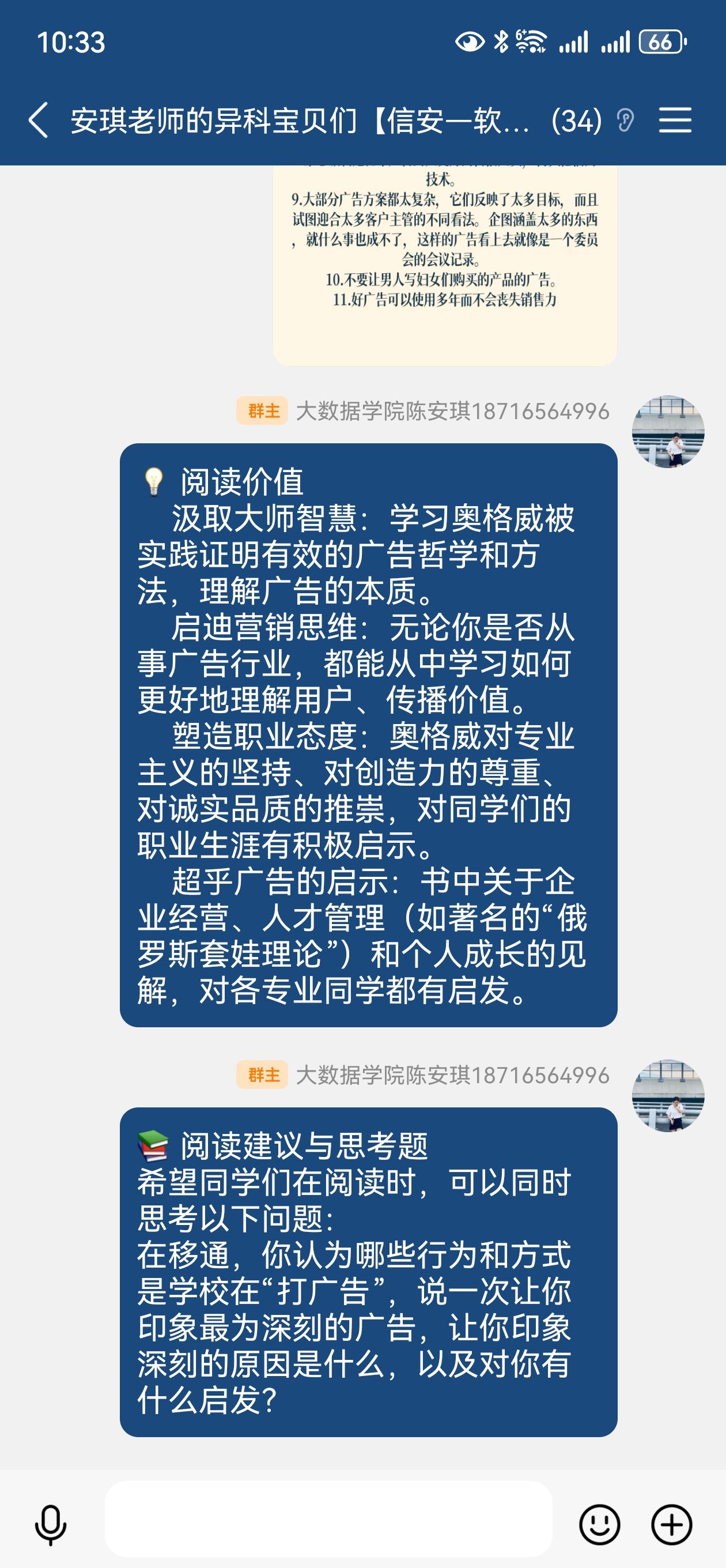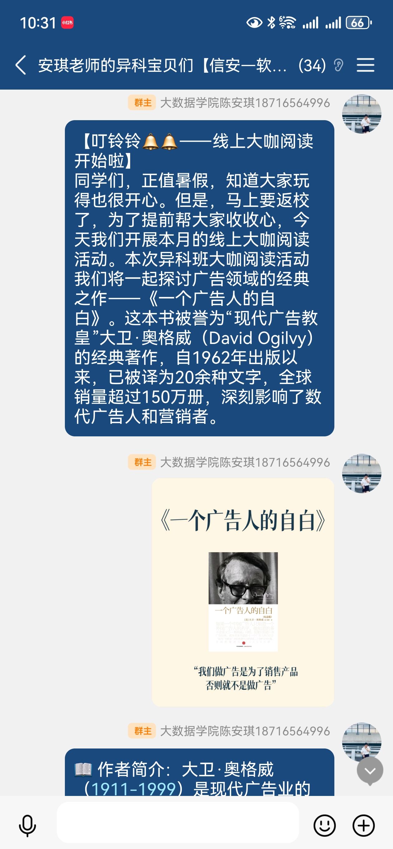 8月13日,我校信息安全学院异科导师陈安琪组织2024级软件工程高本16班、17班学生开展线上大咖阅读活动,共同探讨广告领域经典著作《一个广告人的自白》,引导学生从广告大师的智慧中汲取营养,提升商业思维与职业素养。