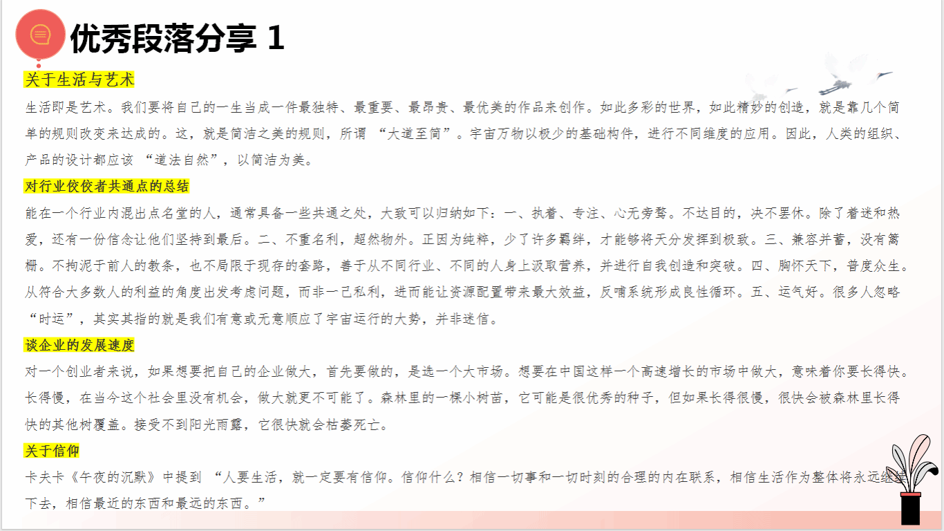 其他同学也在暑期对书籍进行慢阅读,并将书中的知识与日常体验深度联结。陈诺言同学分享《创始人手记》时提到在研读携程、如家、华住三家企业的创办人季琦的随笔集时进行了“场景化联想”,从作者平衡企业管理与个人生活的章节中联想到自己如何更好的规划学习、时间与休息的经历,并在其具备人文温度的日常管理中看见了长期主义的坚守。
