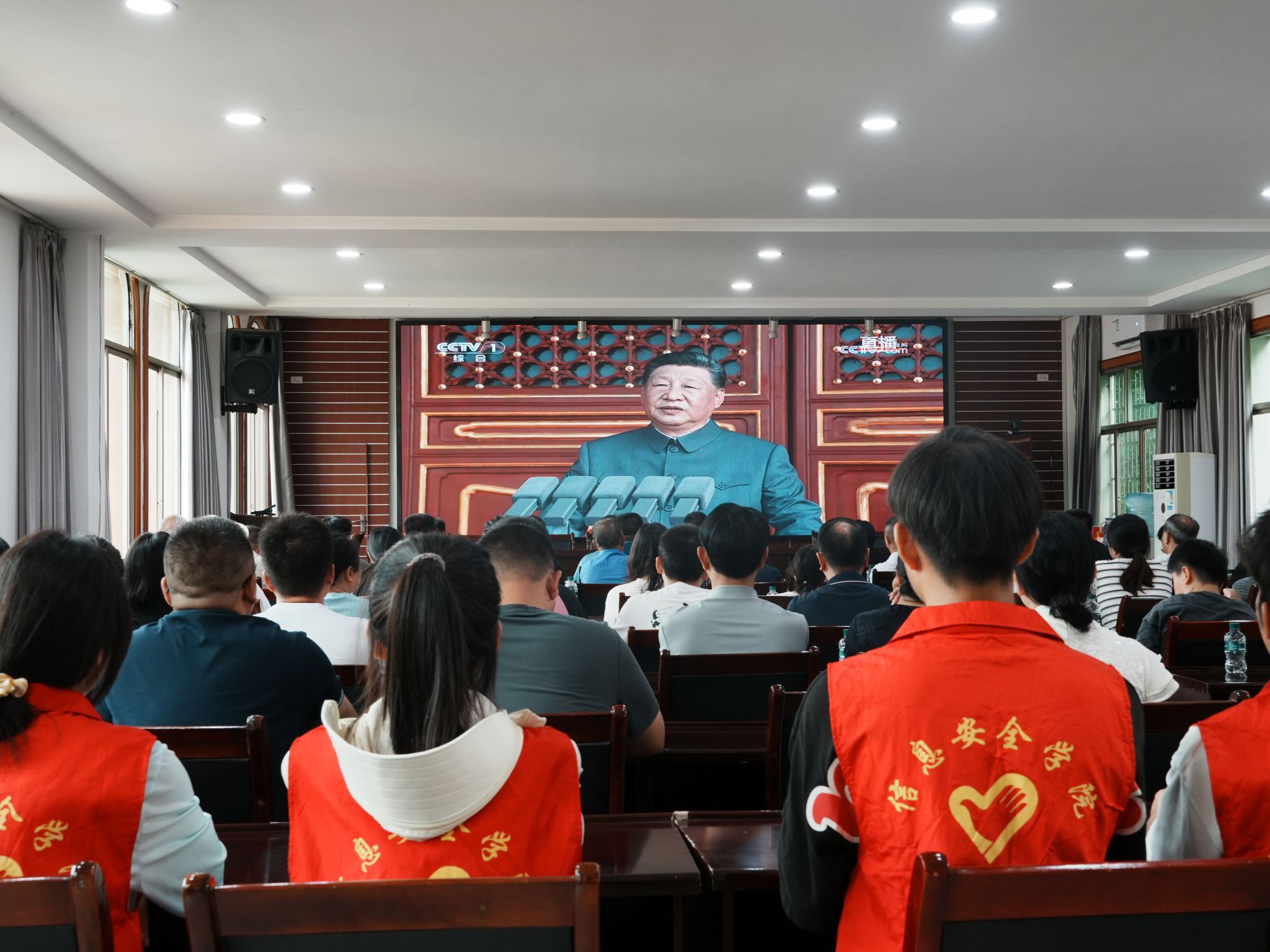 志愿者和老兵齐聚在大屏幕前,不自觉的为整齐的方阵和先进的武器装备爆发出阵阵掌声和欢呼声。老兵看着今日祖国强大的军事力量,感慨着祖国的日益强盛,也为自己曾经为国防事业贡献力量而感到无比骄傲。