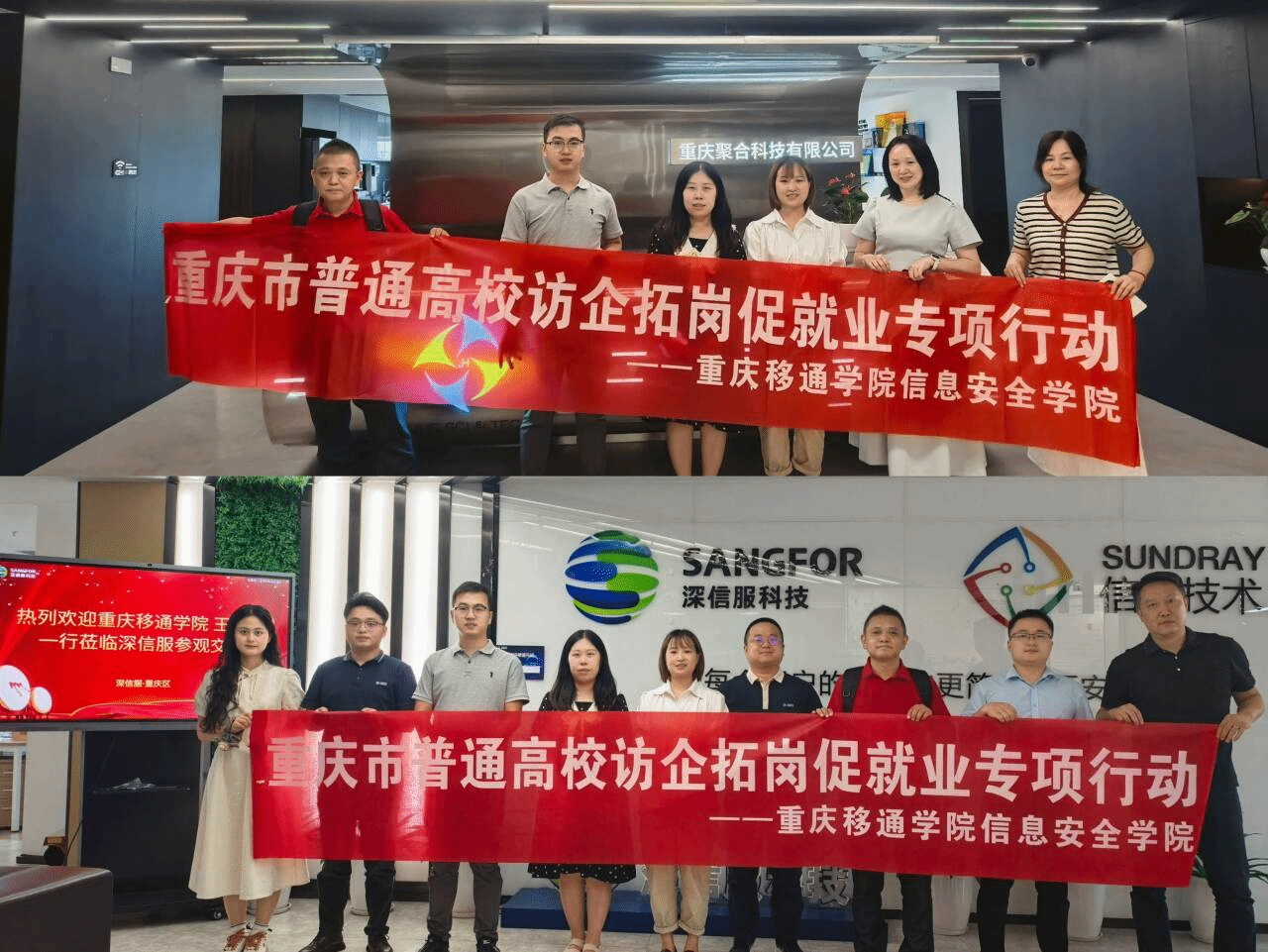 2025年9月4日,为精准对接产业前沿,拓宽学生高质量就业通道,信息安全学院党总支副书记尹金维,信息安全学院物联网工程教研室主任郑慧娟、网络工程教研室主任黄海军率队,携信息安全学院物联网工程教研室教师王前云、就业创业助理团指导老师焦梦玲先后走访深信服科技有限公司与重庆聚合科技有限公司,围绕人才培养、实习就业、校企协同育人等议题展开深度交流。