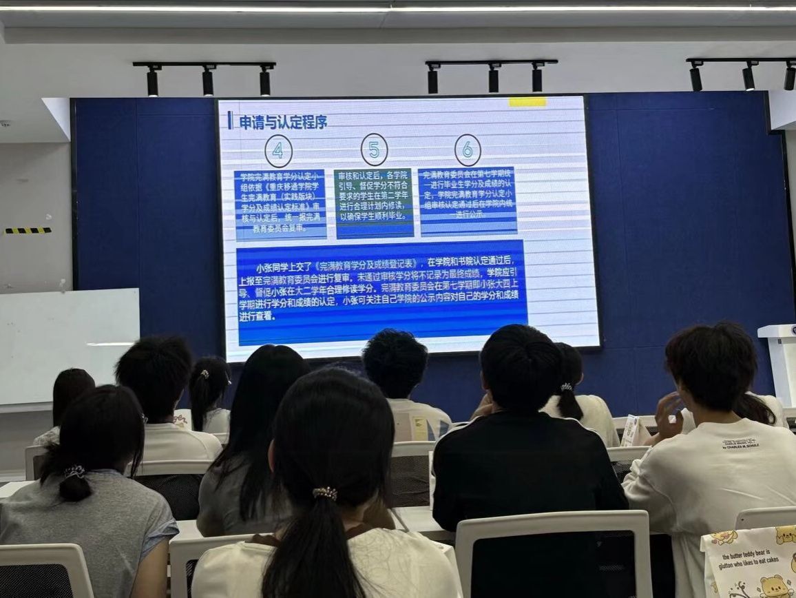 2025年9月10日下午,由信息安全学院学生会学习部主办的“完满密钥·安全启航”完满教育学分修读指南活动在綦河书院观涛多功能报告厅顺利举行。本次活动面向2025级各班班长、团支书及学习委员,旨在系统解读完满教育学分的修读路径与重要意义,帮助新生准确把握学业规划方向,全面提升综合素质。