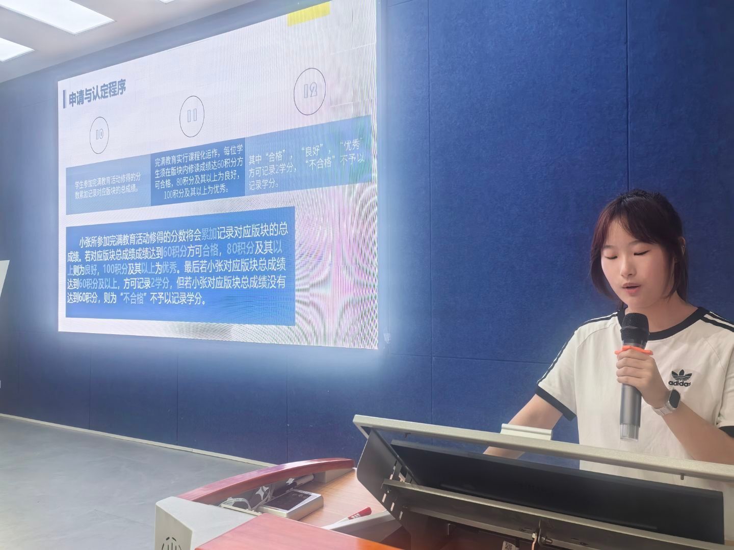活动伊始,学生会学习部干部廖雅婕同学对完满教育学分政策进行了详细解读。她结合学风建设的具体目标与往届优秀案例,深入阐述了积极参与完满教育活动对个人成长与专业发展的促进作用,并鼓励各班班委发挥带头作用,引导班级同学合理规划学业、踊跃参与各类实践项目与竞赛活动。
