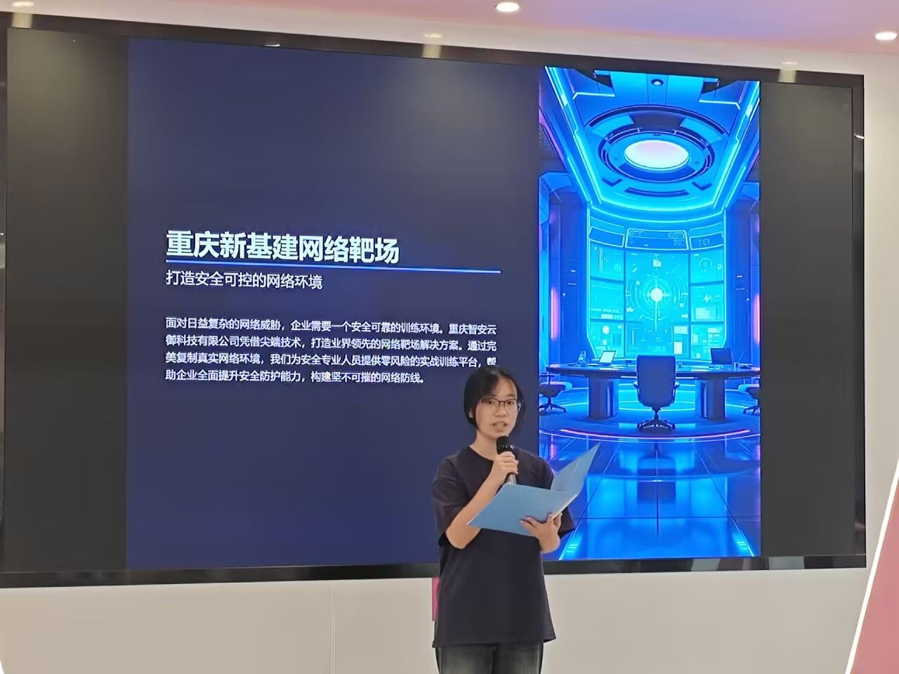 宣讲会以主持人左浩岚开场拉开帷幕,介绍了该公司运营的綦江重庆新基建网络靶场——重庆规模最大、功能最全的区域性安全服务验证平台,具备攻防演练、人才培训等综合能力,未来将布局西部网络安全产业。