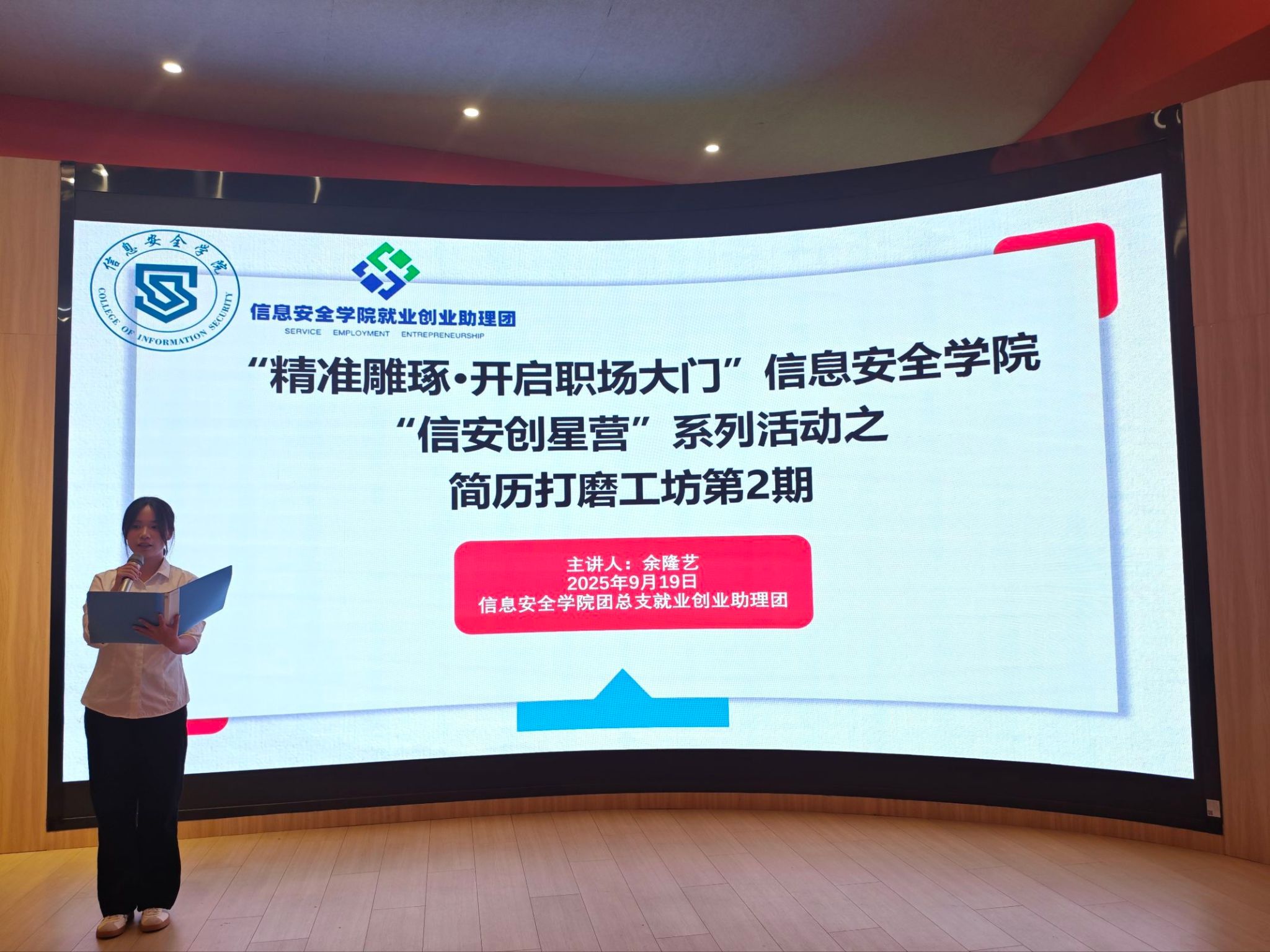 为了帮助信安学子精准掌握制作简历的精髓,清晰展现个人优势、应变能力与专业素养。信息安全学院就业创业助理团于2025年9月19日14:00—16:00在古剑书院·含光报告厅开展“精准雕琢·开启职场大门”信息安全学院“信安创星营”系列活动之简历打磨工坊第2期,本次活动邀请到余隆艺老师,共计20余名学生参与,由左浩岚同学主持。