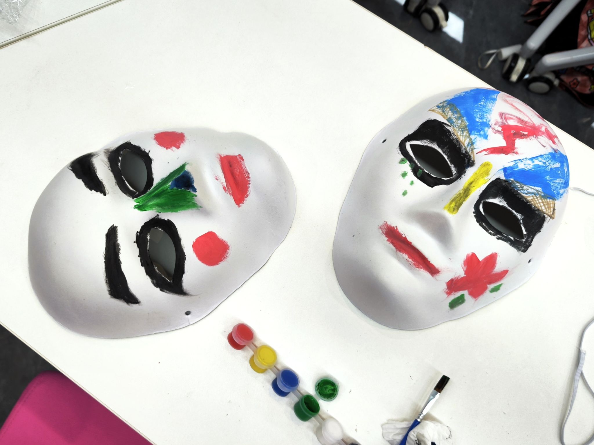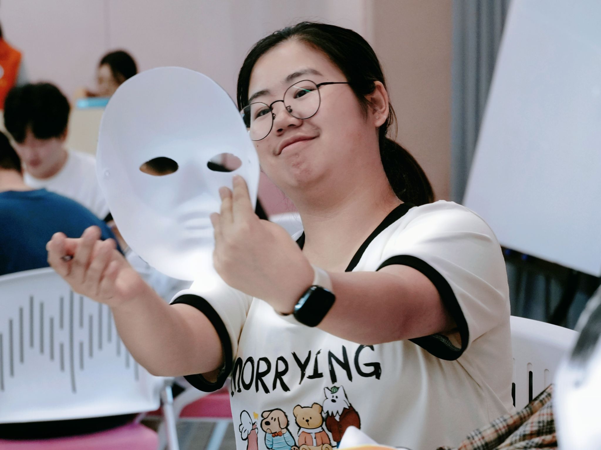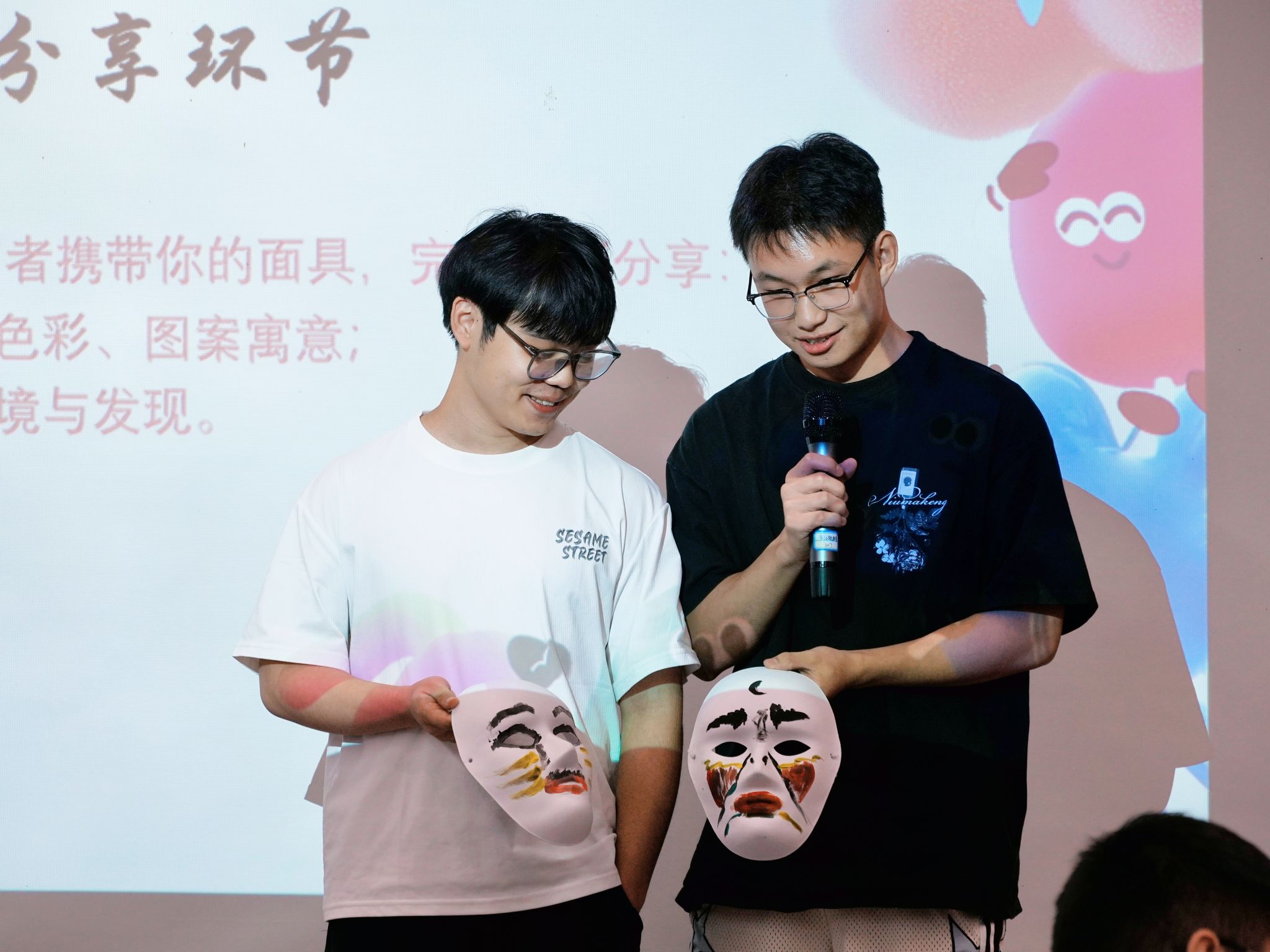 同组伙伴互相绘制“他人眼中的我”,勾勒对方的外在形象;同学们再用空白面具绘制“我眼中的我”,呈现心底的真实自我。志愿者邀请大家上台分享创作思路,让面具成为剖开自我、解开“心壳”的钥匙。