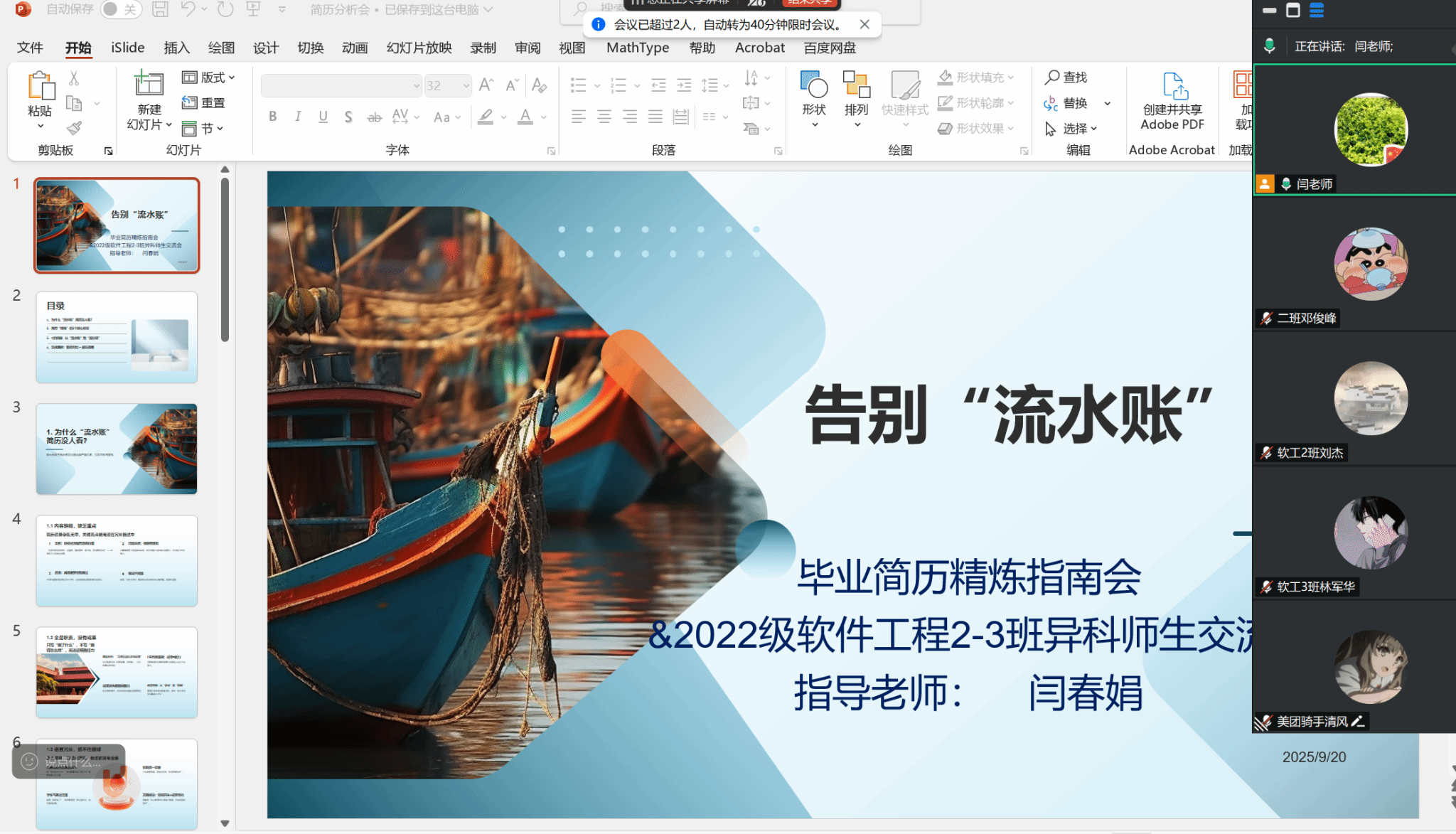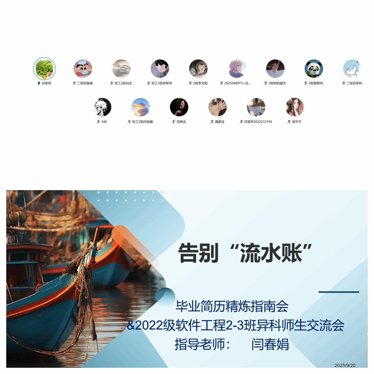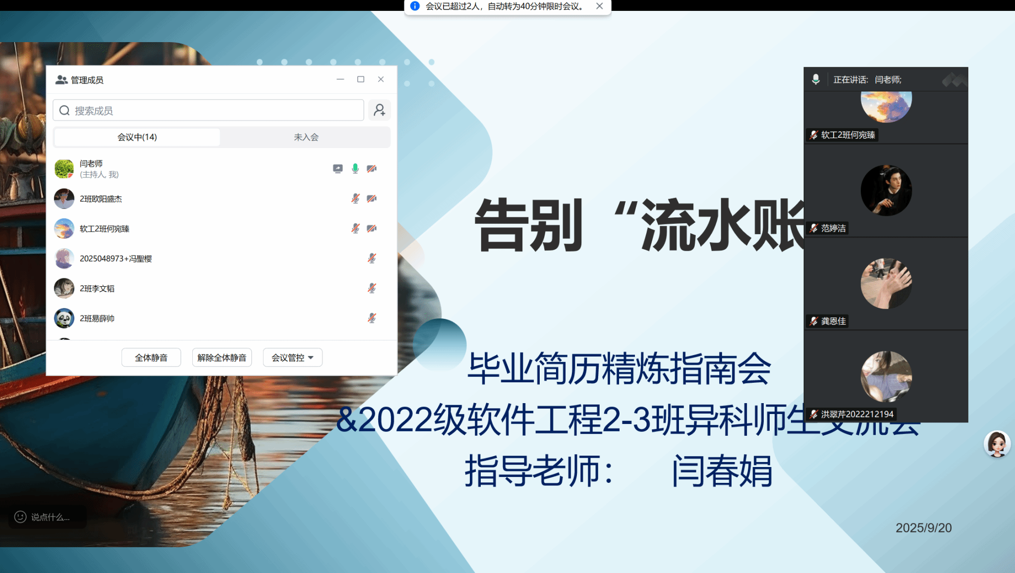 为助力2022级软件工程专业学生打造高质量毕业简历,提升求职竞争力,助力职场第一步于2025年9月20日,“告别‘流水账’——毕业简历精炼指南会暨2022级软件工程2-3班异科师生交流会”在腾讯会议线上举行,本次会议由异科生指导教师闫春娟老师主持,15名同学参与了次会议。