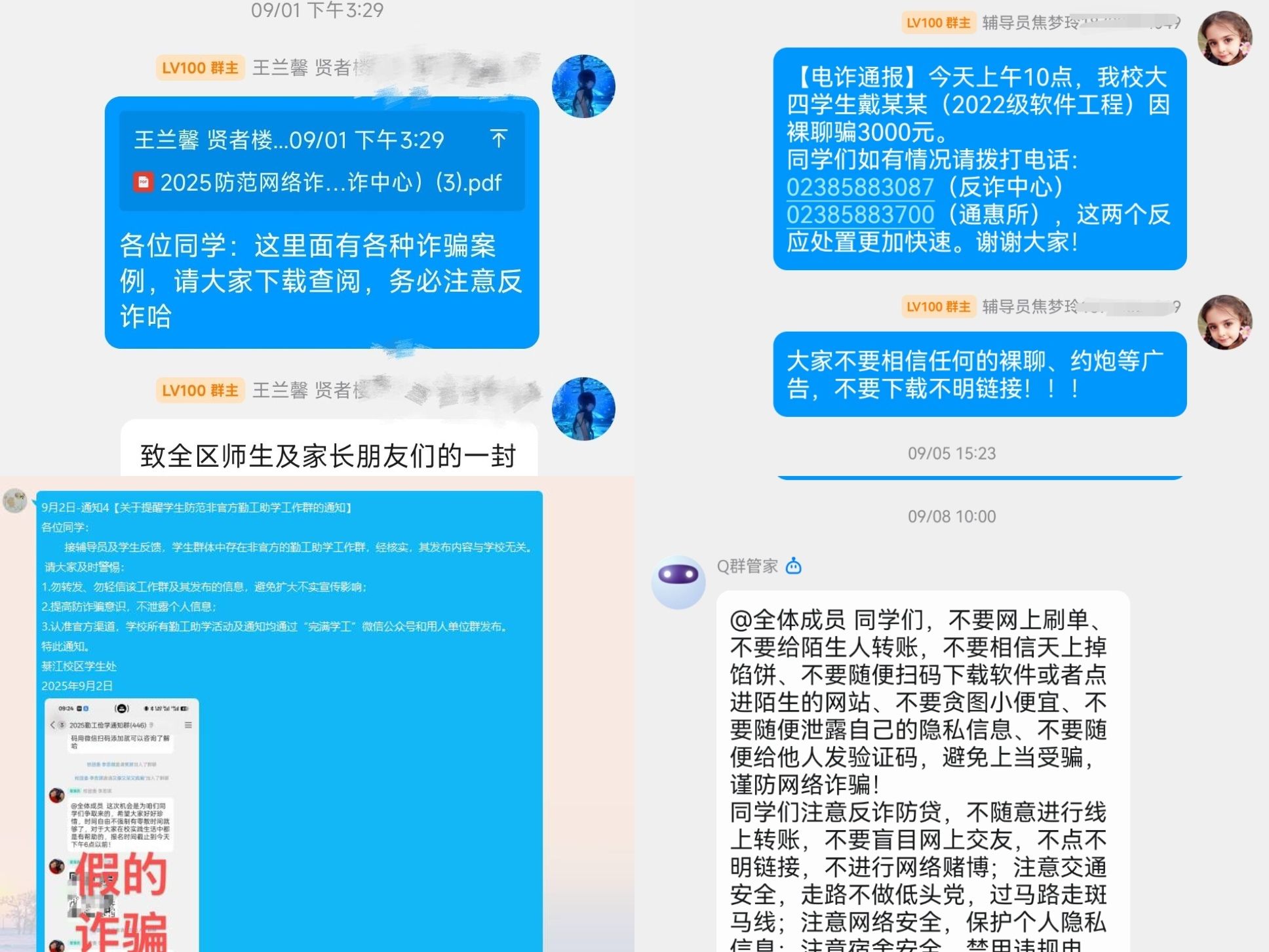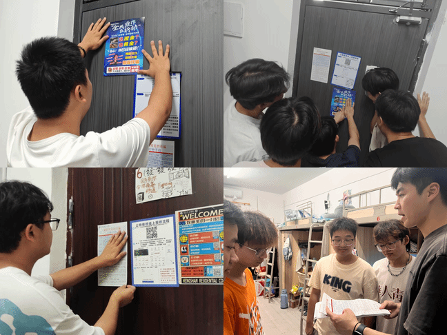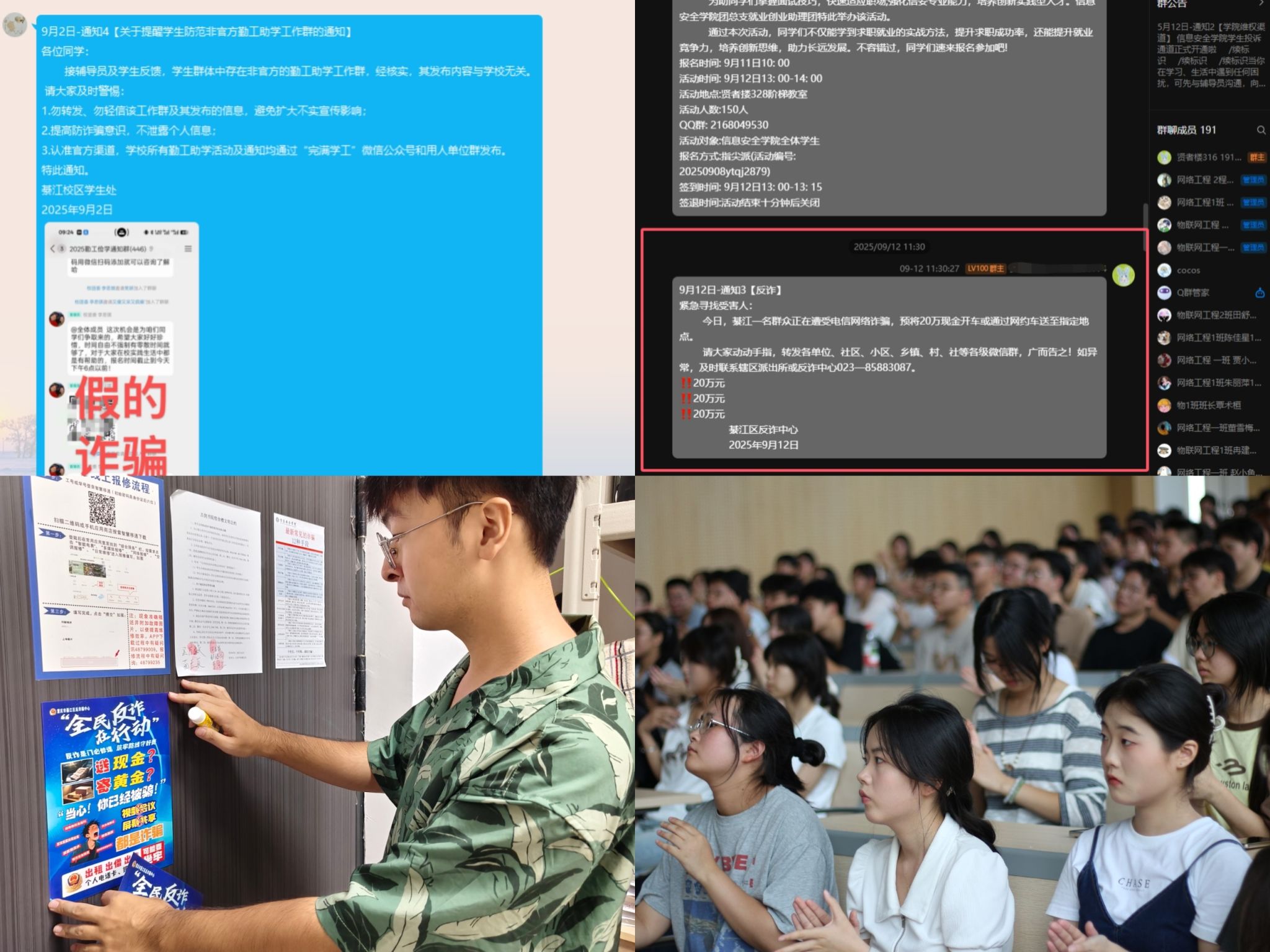 线下活动中,辅导员和异科导师依托主题班会,组织学生系统学习《2025防范网络诈骗手册》并结合校内真实诈骗案例,深入剖析诈骗手法、受害者心理,强调同学们应从“身边事“中汲取教训,增强对诈骗手段的辨别能力和警惕意识。此外,学生骨干们积极行动,在宿舍区域粘贴反诈宣传单,营造“时时提醒、处处防范”的浓厚氛围,强化了学生们的日常防范意识。