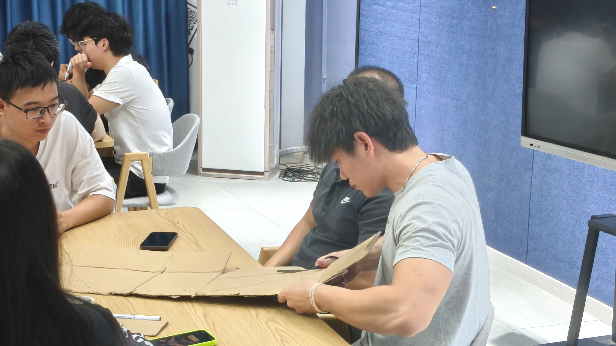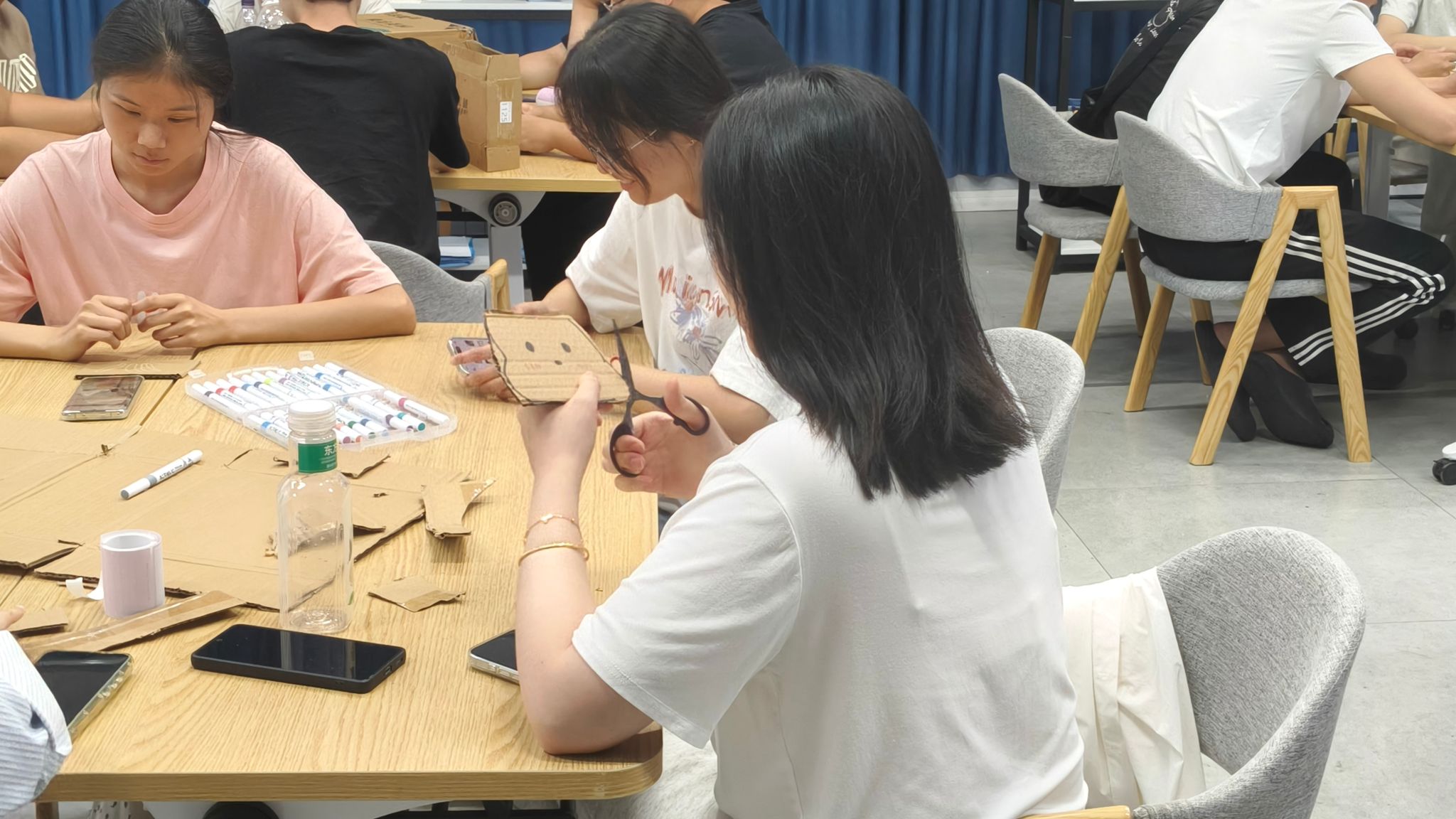 活动伊始,主持人进行“创意收纳工坊”介绍。随着活动拉开帷幕,各宿舍成员围坐桌前,将平日里闲置的纸箱、塑料瓶、旧布料等废旧材料化作创作原料,分工间尽显默契:有人执笔,为收纳盒勾勒规整轮廓;有人巧用胶带层层加固,筑牢实用根基;更有同学以彩笔、贴纸点缀,让收纳工具兼具颜值与功能。