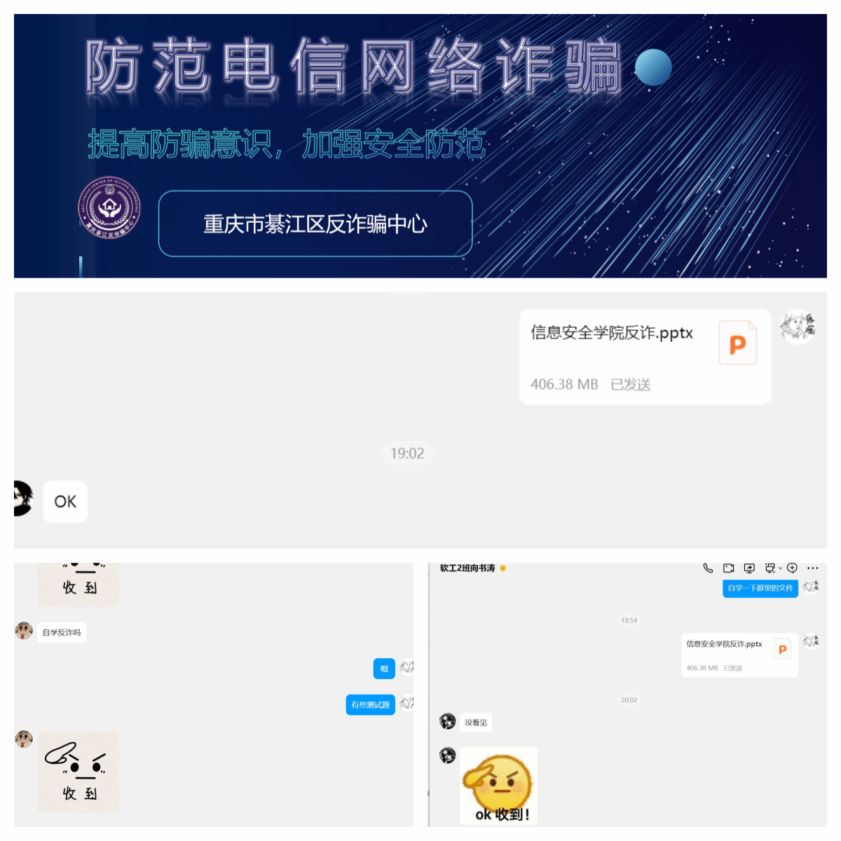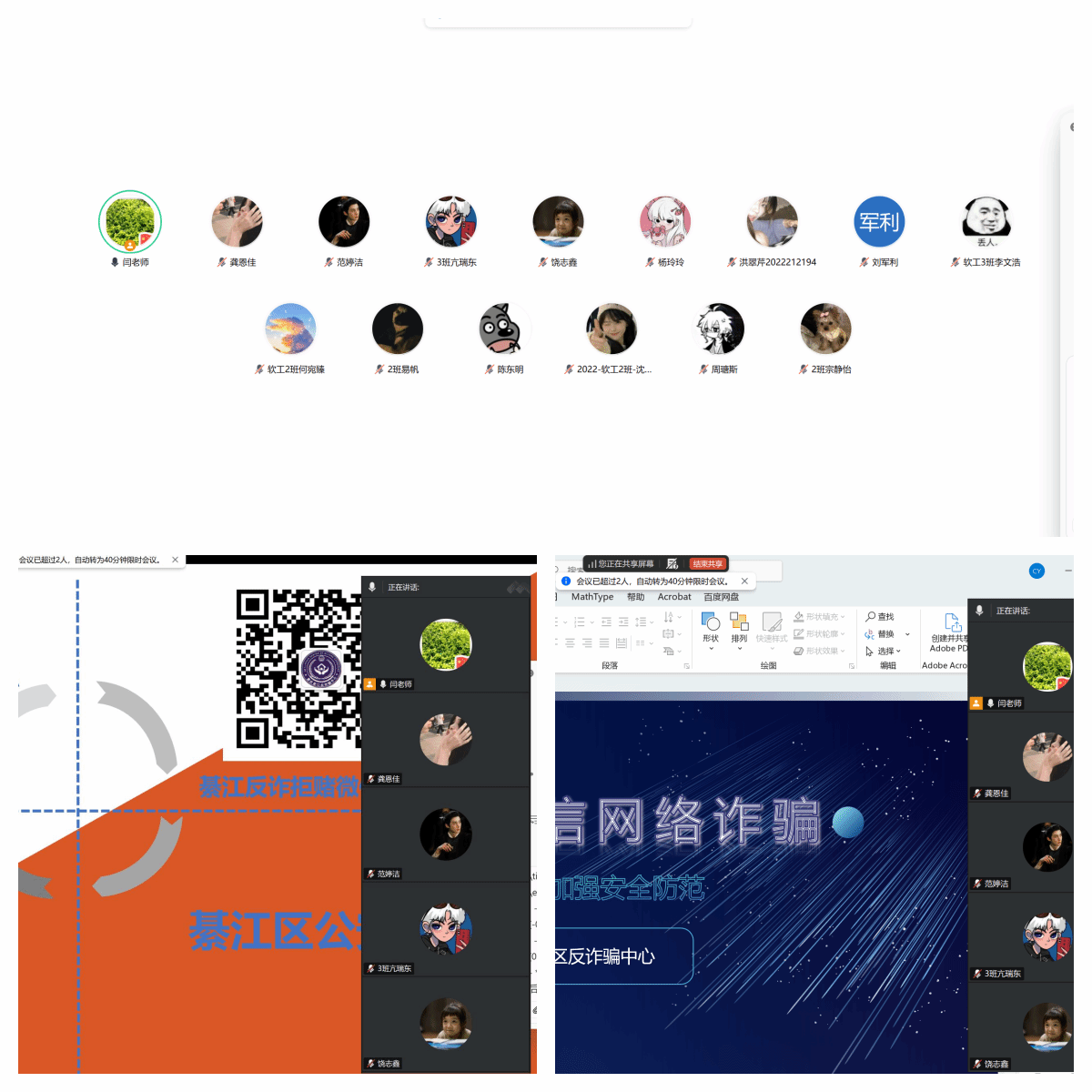 按学校及学院精神围绕《重庆市綦江区反诈骗中心防范电信网络诈骗》专项文件,结合大四学生学习实习地点比较分散,以“线下实践+线上联动”模式开展学习活动:学生蒋林峰同学牵头主持13名同学线下互动学习,异科生指导闫春娟老师同步线上召集14名同学专题学习,其余7名同学自己学习,达到全面覆盖,师生协同筑牢校园反诈防线。