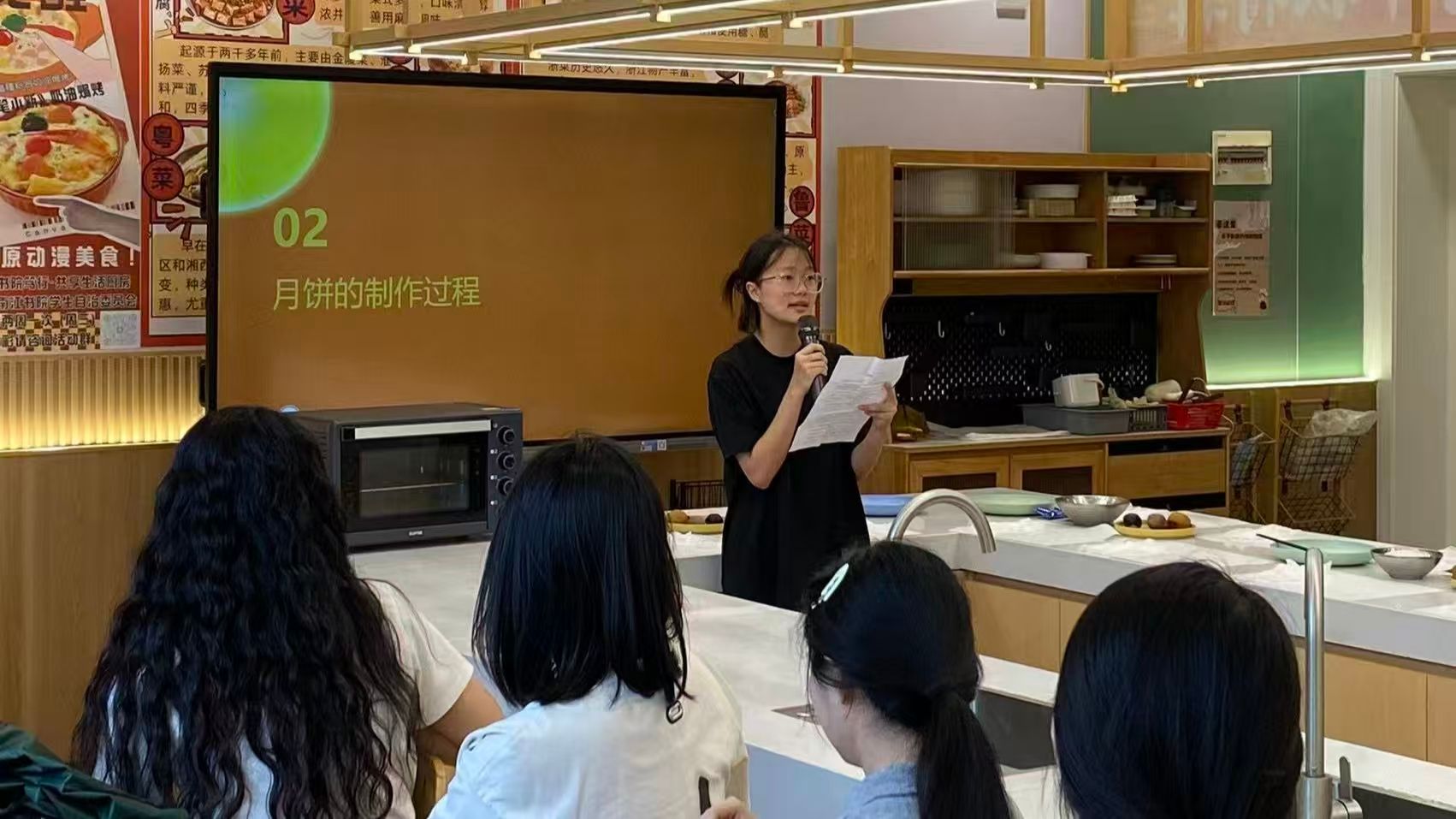 主持人借着粉白面团、各色馅料,伴着清晰的教学视频,将月饼制作的传统技法细细拆解——从饼皮揉制的软硬拿捏,到馅料配比的酸甜平衡,再到压模成型的力度把控,每一步都讲解得细致入微,同时反复强调食材卫生与厨具安全,为同学们筑牢实践基础。