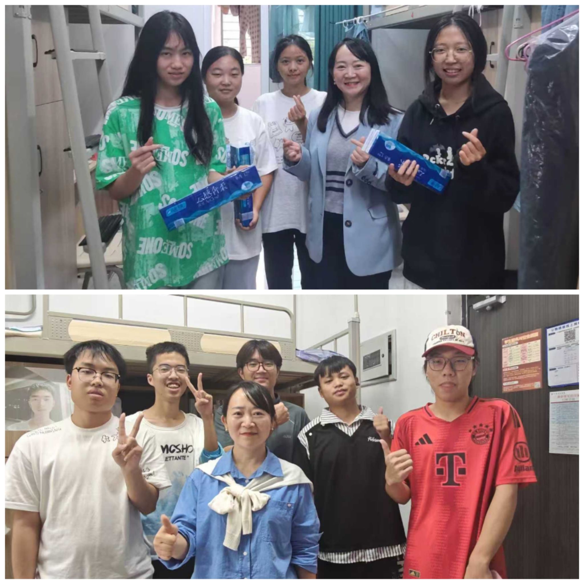 异科导师携带提前准备好、清新手帕纸巾,轻叩每间宿舍房门。“最近宿舍通风做得怎么样?”“换季要注意添衣保暖”,异科导师和辅导员一边亲切问候,一边细致检查宿舍安全与卫生:指尖拂过电源插板查看是否存在私拉乱接现象,俯身观察阳台排水是否通畅,随手整理歪斜的书架…… 当将手帕纸巾递到同学们手中时,现场暖意融融。“没想到老师连这种细节都考虑到了,以后去图书馆再也不用到处找纸巾了!”冯同学笑着说道。