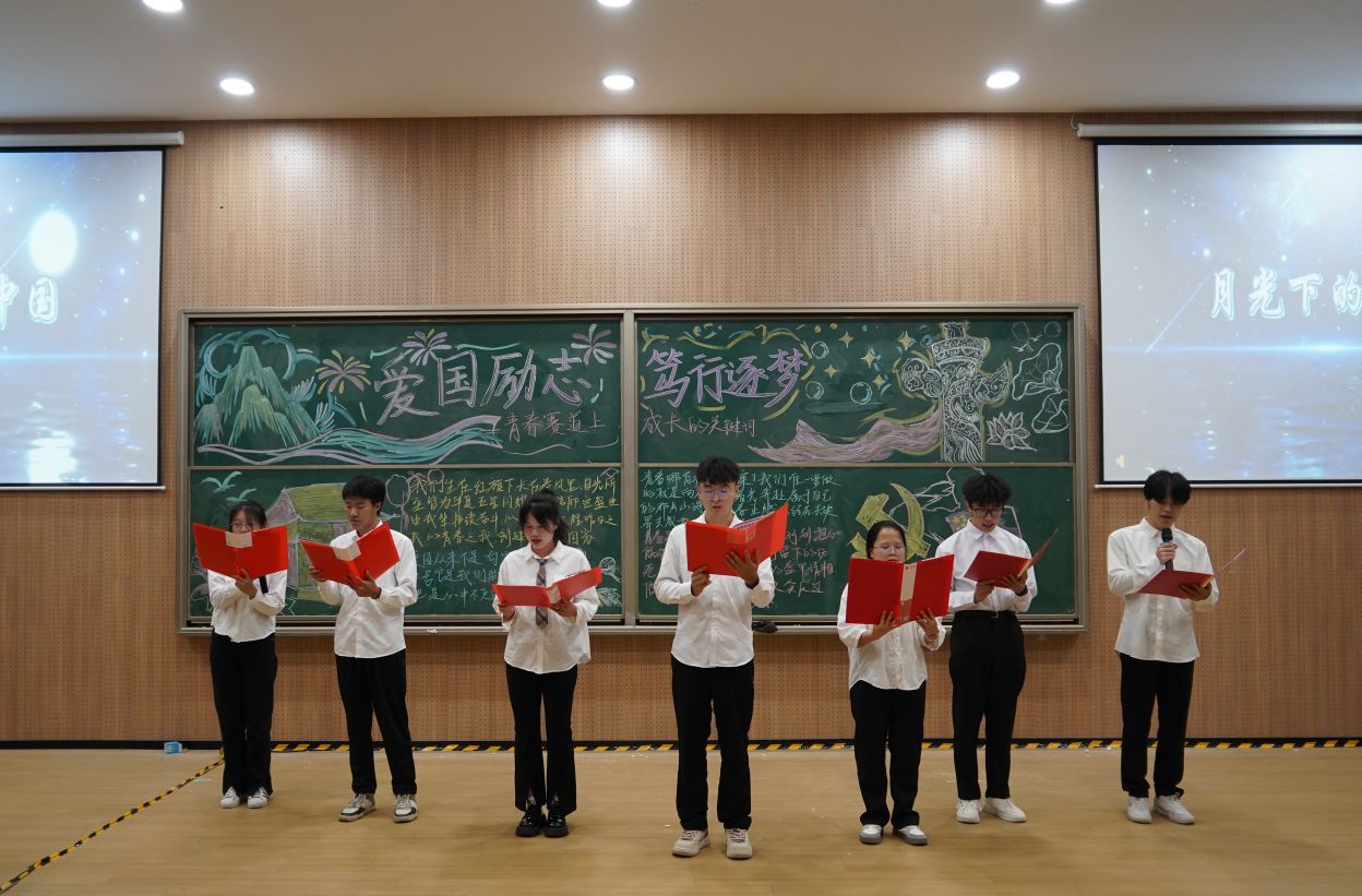 师生代表共同朗诵《月光下的中国》,以温婉而激昂的语调,描绘祖国的静谧美好,诉说新时代青年的赤诚热爱,完成了最深情的青春告白。