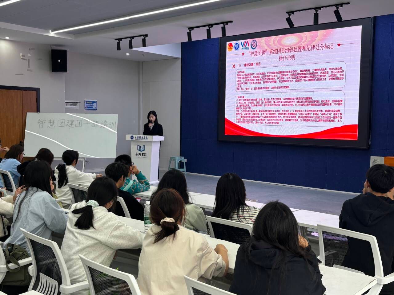 为凝聚信息安全学院团支部骨干力量,进一步加强团组织工作效率,了解“智慧团建”系统操作流程,信息安全学院团总支团直属组织部于10月22日中午12点,于綦河书院观涛·报告厅举办“智慧团建”解读会,由组织部肖茜月作为主讲人,各班团支部干部参加此次会议,重点围绕共青团中央“智慧团建”系统功能操作、常见问题解决方式等方面进行详细讲解。