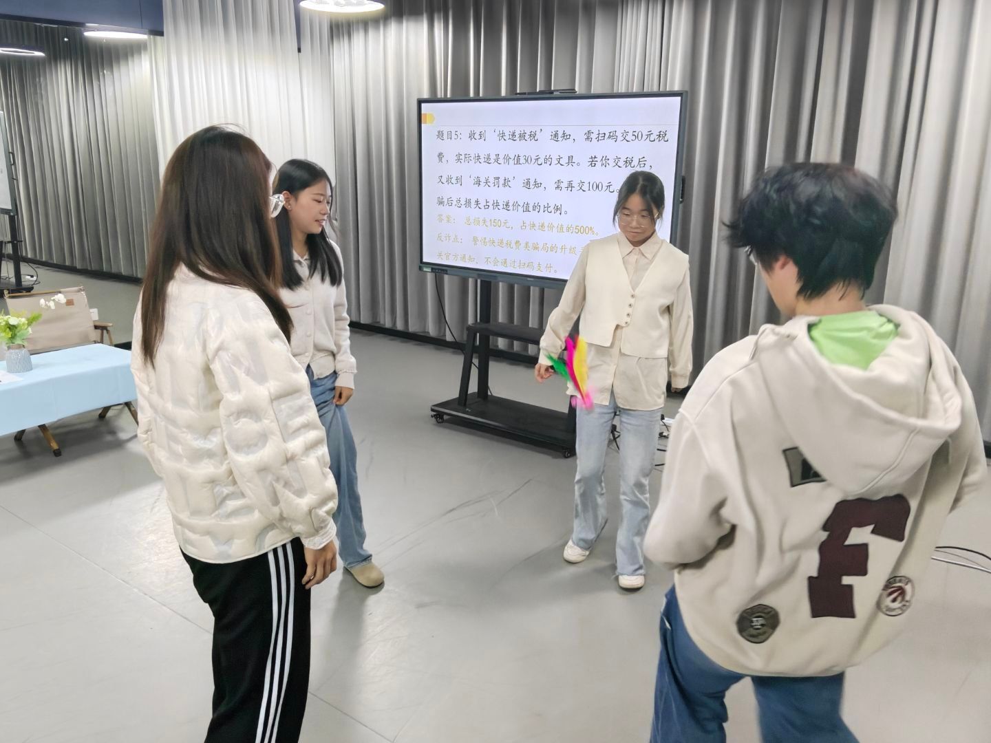 活动精心设置了三轮趣味游戏,每轮游戏的排名直接决定各小组后续答题机会,形成有效激励机制。“踢毽子”热身环节迅速拉近参与者距离;“呼啦圈传递”考验团队协作,将现场气氛推向高潮;最后的“成语接龙”则锻炼思维敏捷性。这一设计显著提升了同学们的参与积极性。答题环节紧密衔接,内容覆盖快递代收、网购分期、直播带货等常见消费场景,通过层层递进的生活化案例,有效强化了学生的风险防范意识。