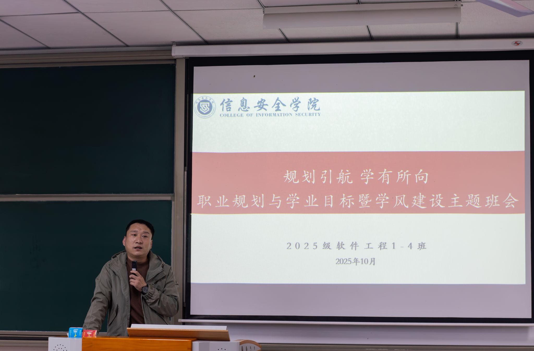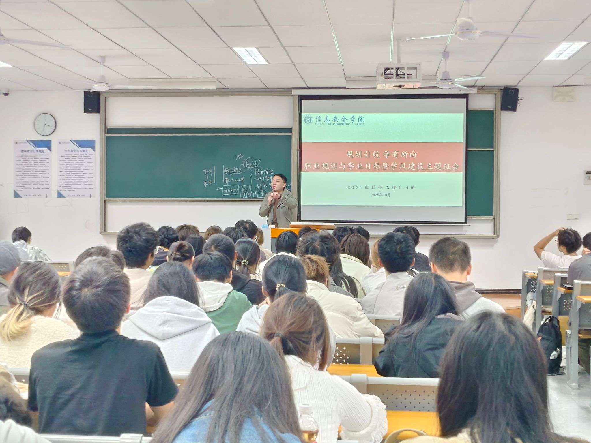 为筑牢学风根基,引导学生明确学业与职业方向,2025年10月27日下午15:00在勇者楼304,信息安全学院软件工程1-4班召开了“锚定目标·赋能未来”学风建设暨安全警示主题班会,将学业规划、职业指导与素质培养深度融合,由辅导员邹健为学生成长注入清晰动能。