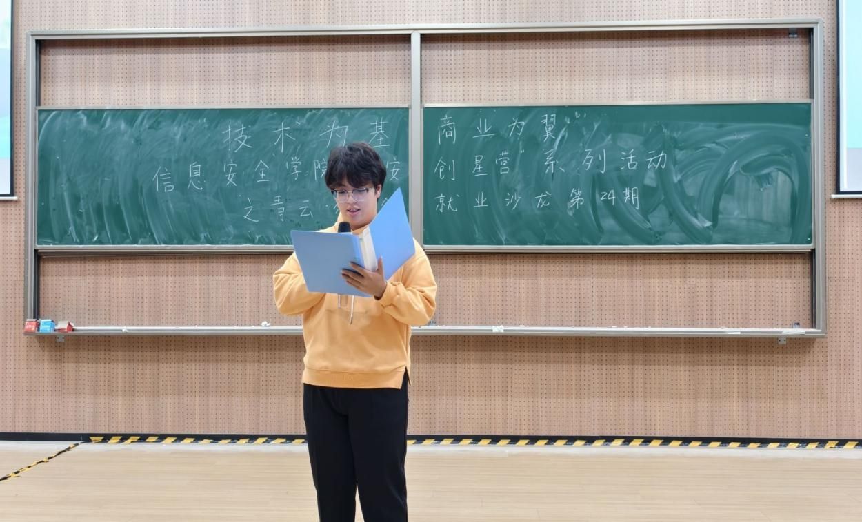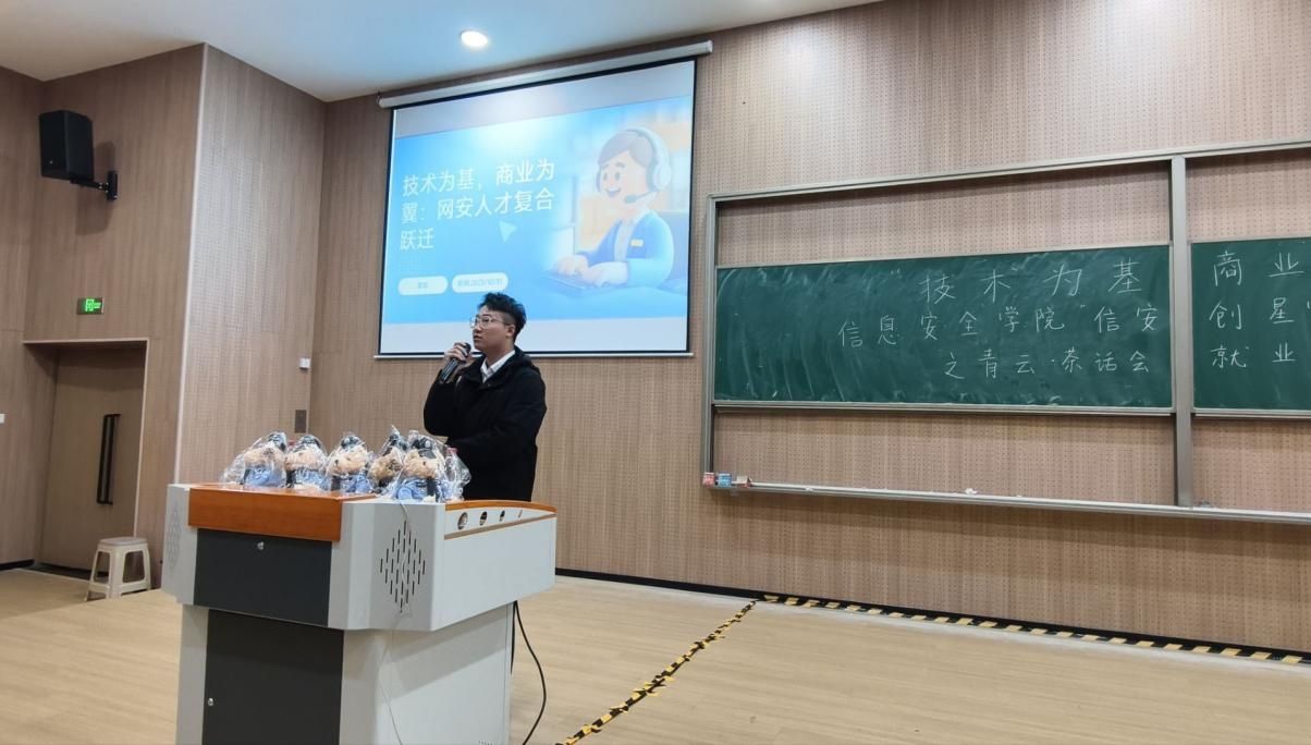 为提升同学们的就业意识,培养正确的就业理念,助力职业发展规划,信息安全学院就业创业助理团于2025年10月31日在贤者楼328开展了“技术为基·商业为翼”信息安全学院“信安创星营”系列活动之青云·茶话会就业沙龙第24期,此次活动由柴青成同学主持,覃帆老师担任主讲,近300名学生参与。