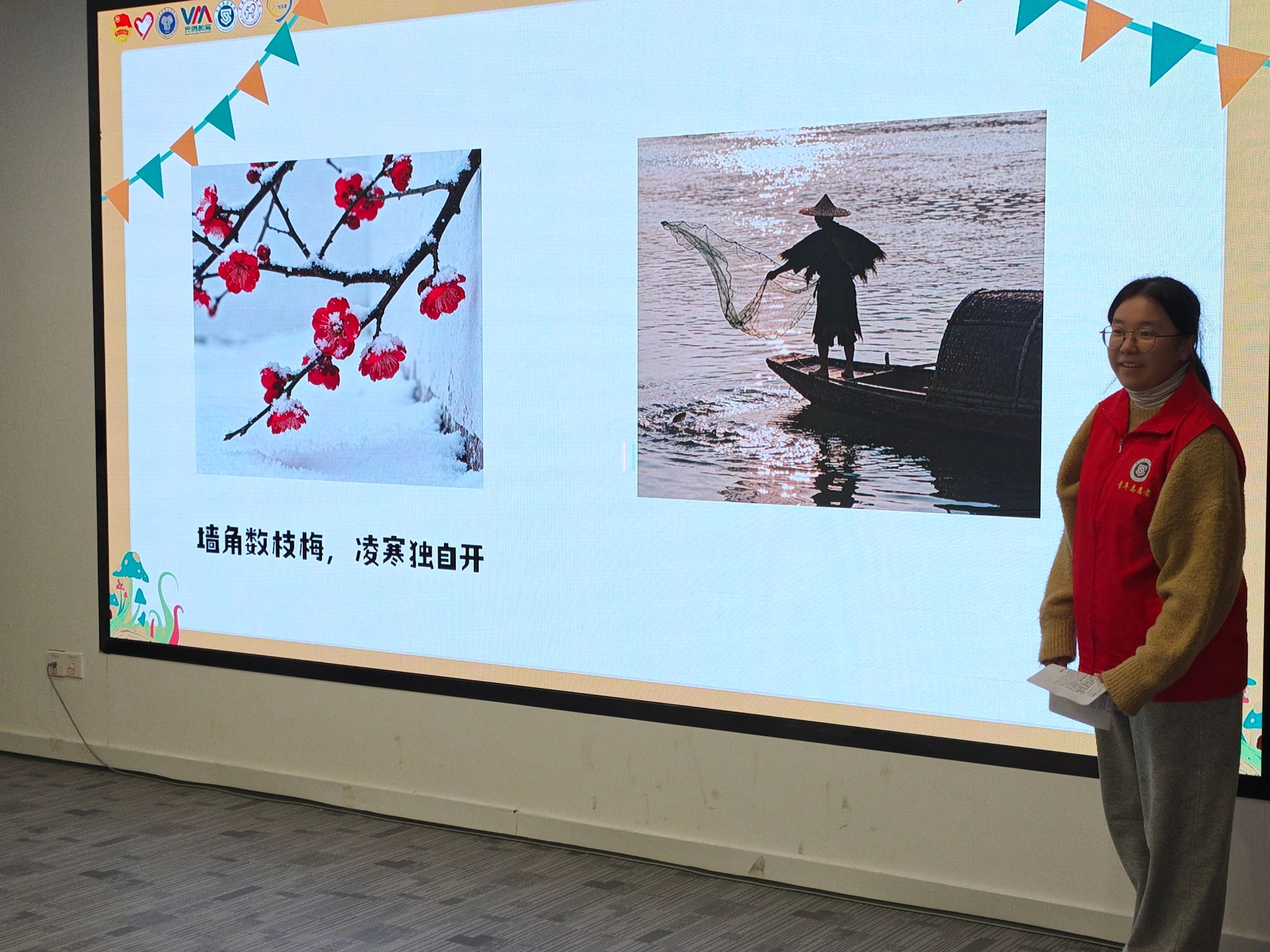 活动伊始,志愿者展示了绘有古诗意境的简笔画,邀请孩子们猜对应的诗名。小朋友们踊跃举手回答,这一互动迅速点燃了现场气氛,并引入了传统文化的主题。