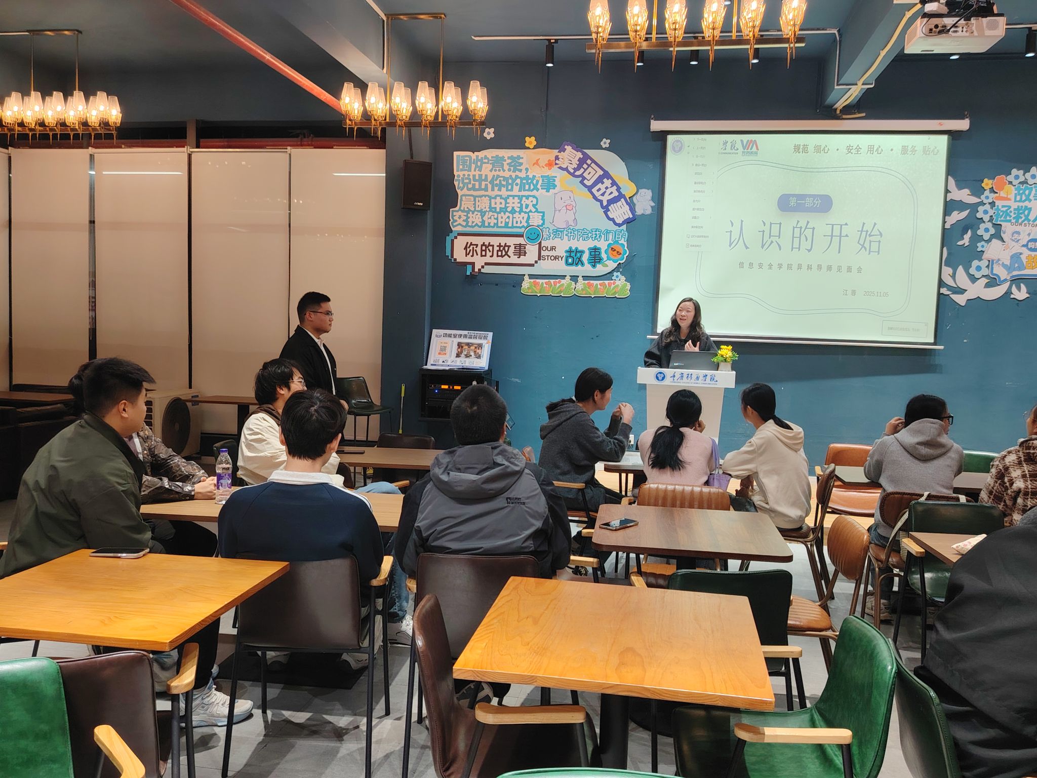 在相互熟悉之后,江蓉老师结合学校异科导师工作的整体要求,详细讲解了本次异科指导的职责定位与具体工作安排。她表示,后续将围绕“助力学生全面发展” 的核心目标,打造多元化的指导体系:一方面会定期组织集体互动活动,如信息安全主题沙龙、跨专业学习交流会等,帮助同学们拓宽视野、增进交流;另一方面会针对不同同学的兴趣特长与发展需求,提供个性化指导,比如为有科研意愿的同学对接导师资源,为想提升实践能力的同学推荐项目机会;此外,还会开展 “大咖传记阅读计划”,通过共读行业领军人物的成长故事,引导同学们树立正确的职业观与价值观,同时结合同学们的兴趣点开展专业外的技能辅导,全方位提升综合素养。