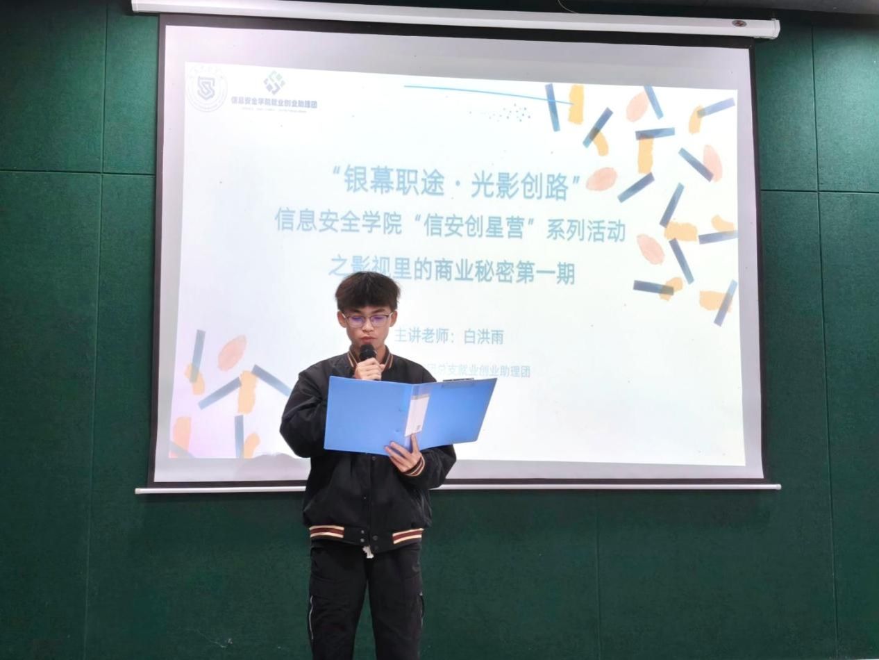 为了引导学生洞察真实职场与创业逻辑,打破传统就业认知,激发多元发展思路,信息安全学院就业创业助理团于2025年11月5日在綦河书院·星云影音室开展了“银幕职途·光影创路”信息安全学院“信安创星营”系列活动之影视里的商业秘密第一期,此次活动由王家乐同学主持,白洪雨老师担任主讲,近50名学生参与。
