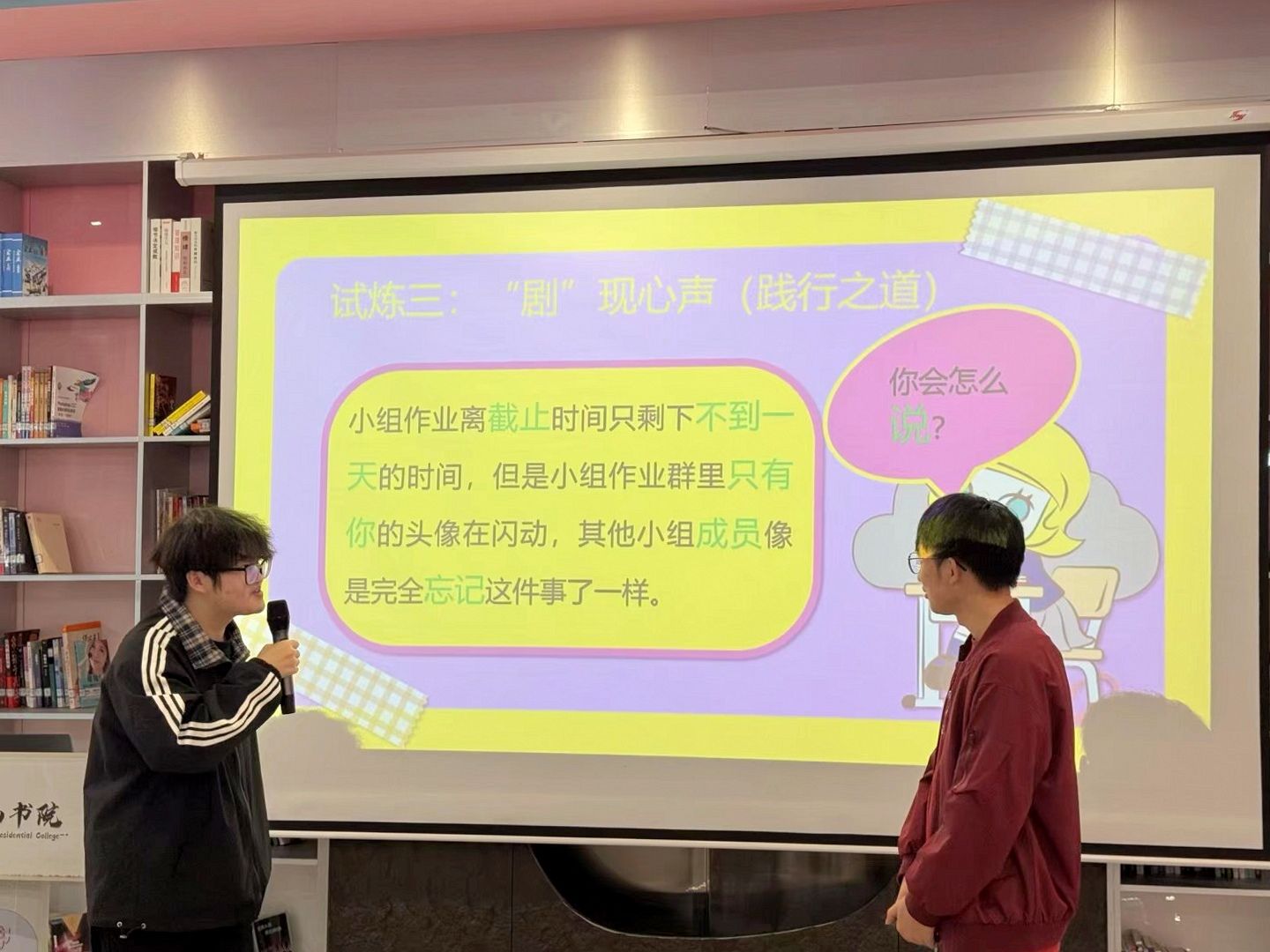 实践环节“‘剧’现心声”聚焦真实场景,学生们模拟面对小组作业截止前的协作困境,并运用“ABC理论”进行沟通实践。通过角色分工与情绪管理,最终顺利完成任务并缓解焦虑情绪,生动诠释了沟通在化解冲突、增进理解中的桥梁作用。