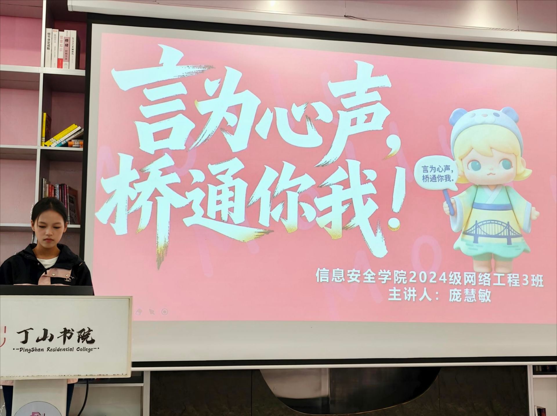 为提升学生沟通能力,建立积极健康的人际联结,2025年11月6日,信息安全学院2024级网络工程3班于丁山书院金牛座书吧开展了“‘言’为心声,桥通你我”心理健康主题班会。辅导员王兰馨老师莅临现场与学生亲切交流。活动通过创意签到、互动游戏、情境模拟等环节,引导学生掌握有效沟通方法。