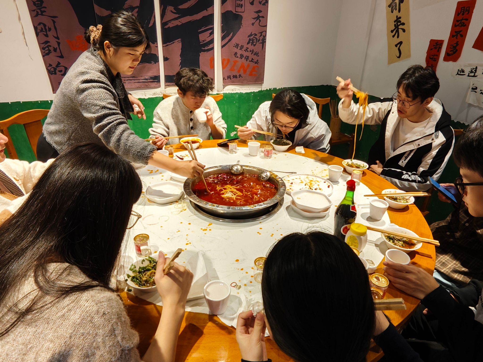店内暖意融融,同学们早早到场忙碌,围坐闫老师身旁,分享复习进度、规划困惑,轻松氛围萦绕餐桌。锅底沸腾后,聚餐正式开启。