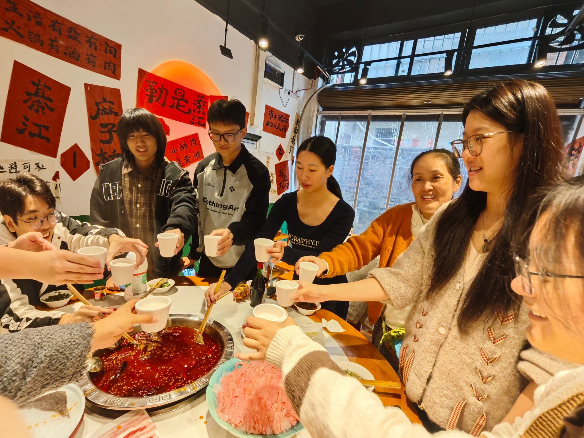 火锅热气升温情谊,同学们约定互帮互助:考研、考公同学共享资料,求职党互通信息,并承诺向闫老师定期反馈动态。