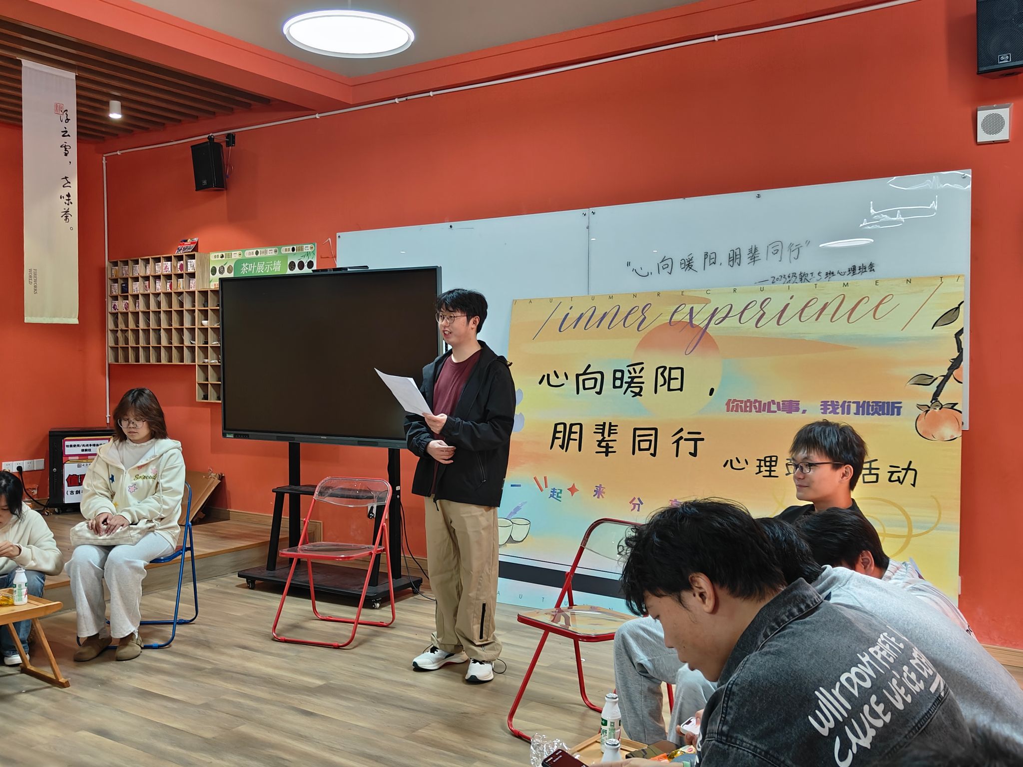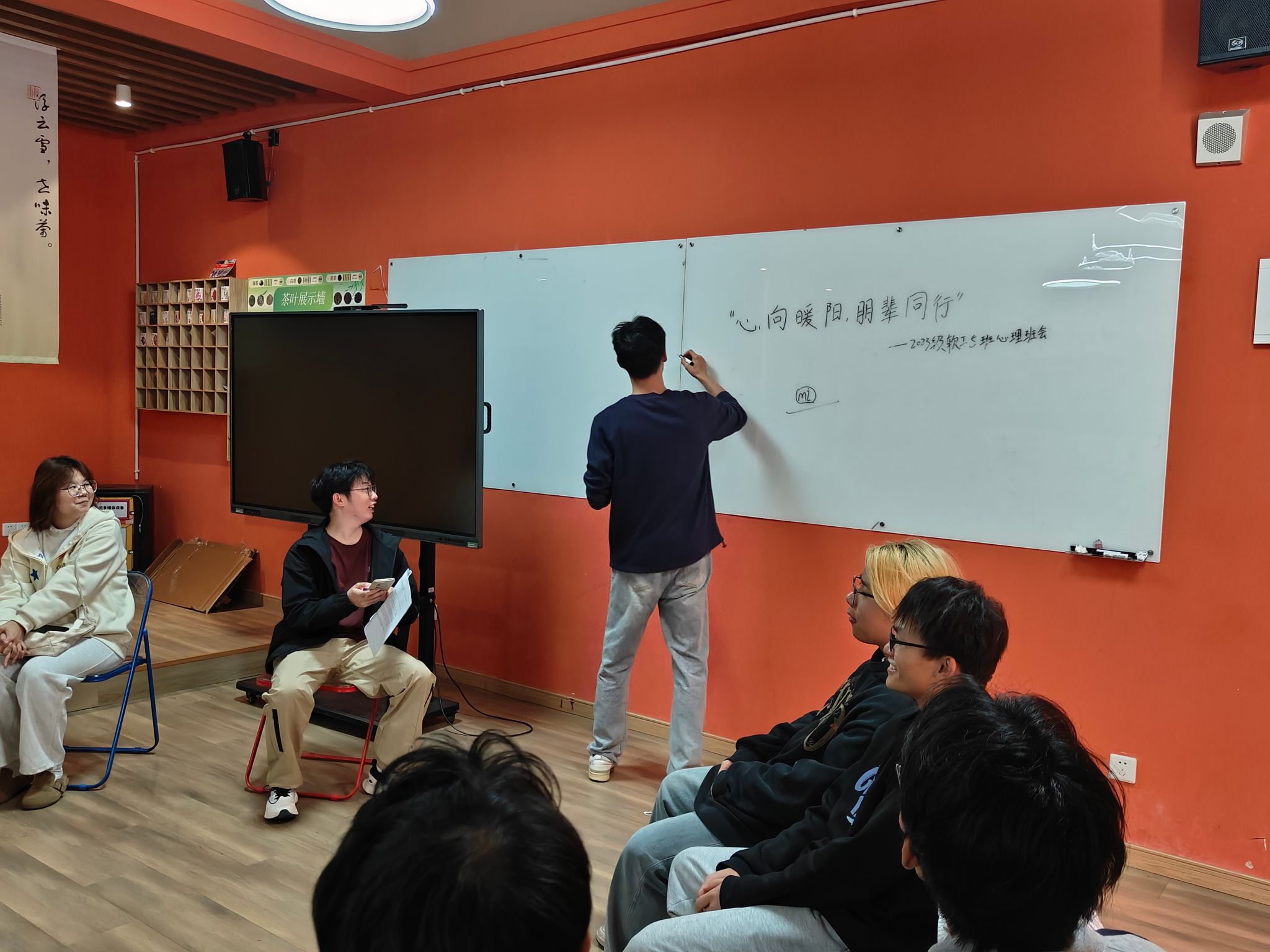 当晚,同学们提前抵达场地,在有序签到后开启这场心灵之约。主持人开场致辞,介绍班会主题与意义,瞬间点燃现场氛围。在“心语初绽・师友启言”环节,心理委员李琦同学以“青春如旷野,人际是星光”为引,分享人际温暖故事;王丹老师结合自身经历,从倾听、理解等角度畅谈沟通智慧,同学们在倾听中共鸣,在思考中拉近心距。