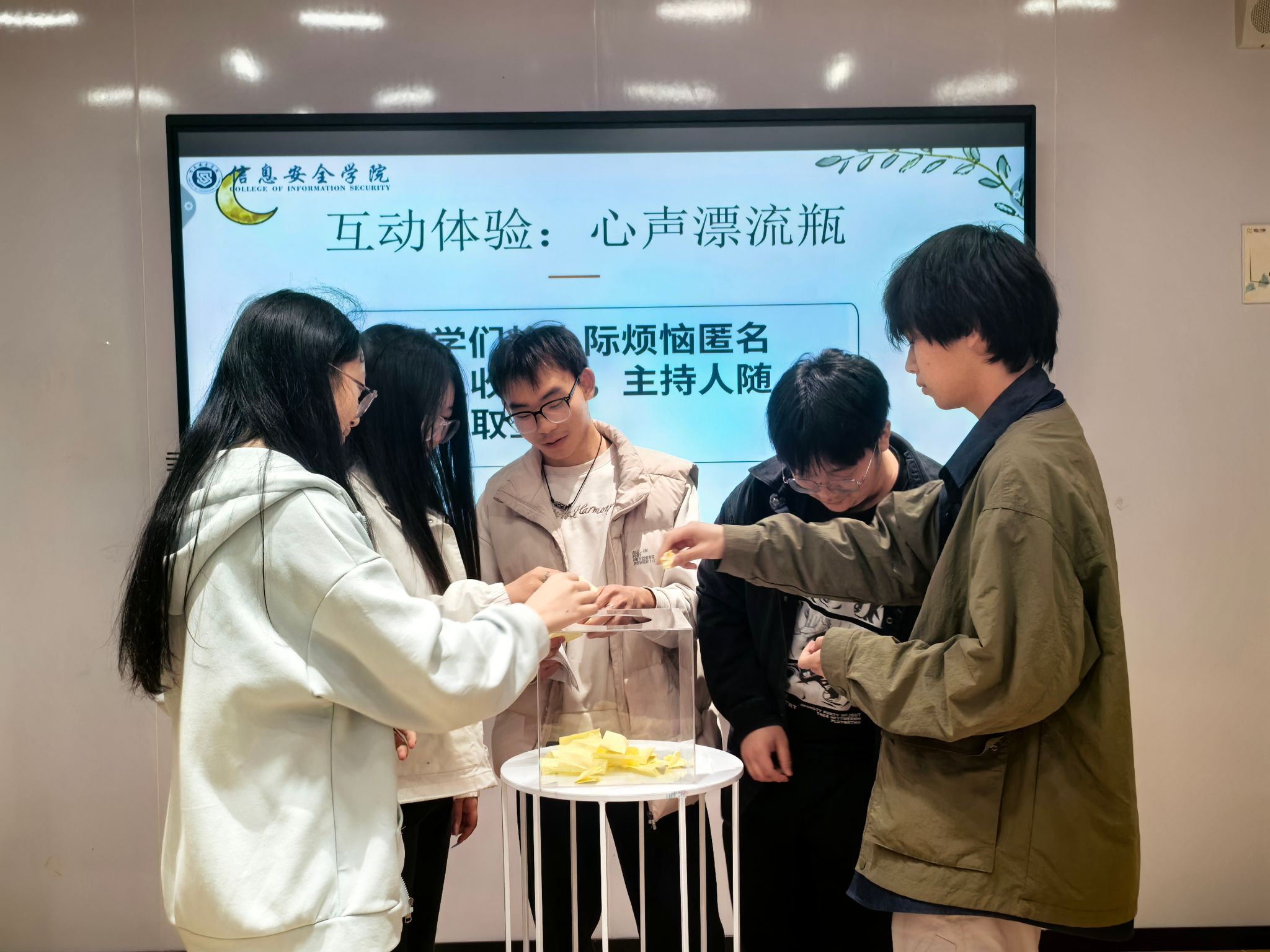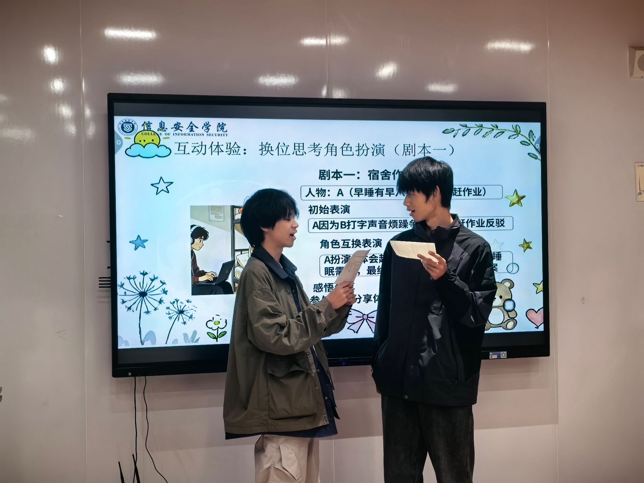 互动环节“搭建心灵桥梁”将班会推向高潮。在“心声漂流瓶”中,同学们匿名分享人际烦恼,集体出谋划策,感受彼此支持;在“换位思考”角色扮演中,同学们通过演绎宿舍矛盾、小组合作纠纷等情景,亲身体验不同立场。