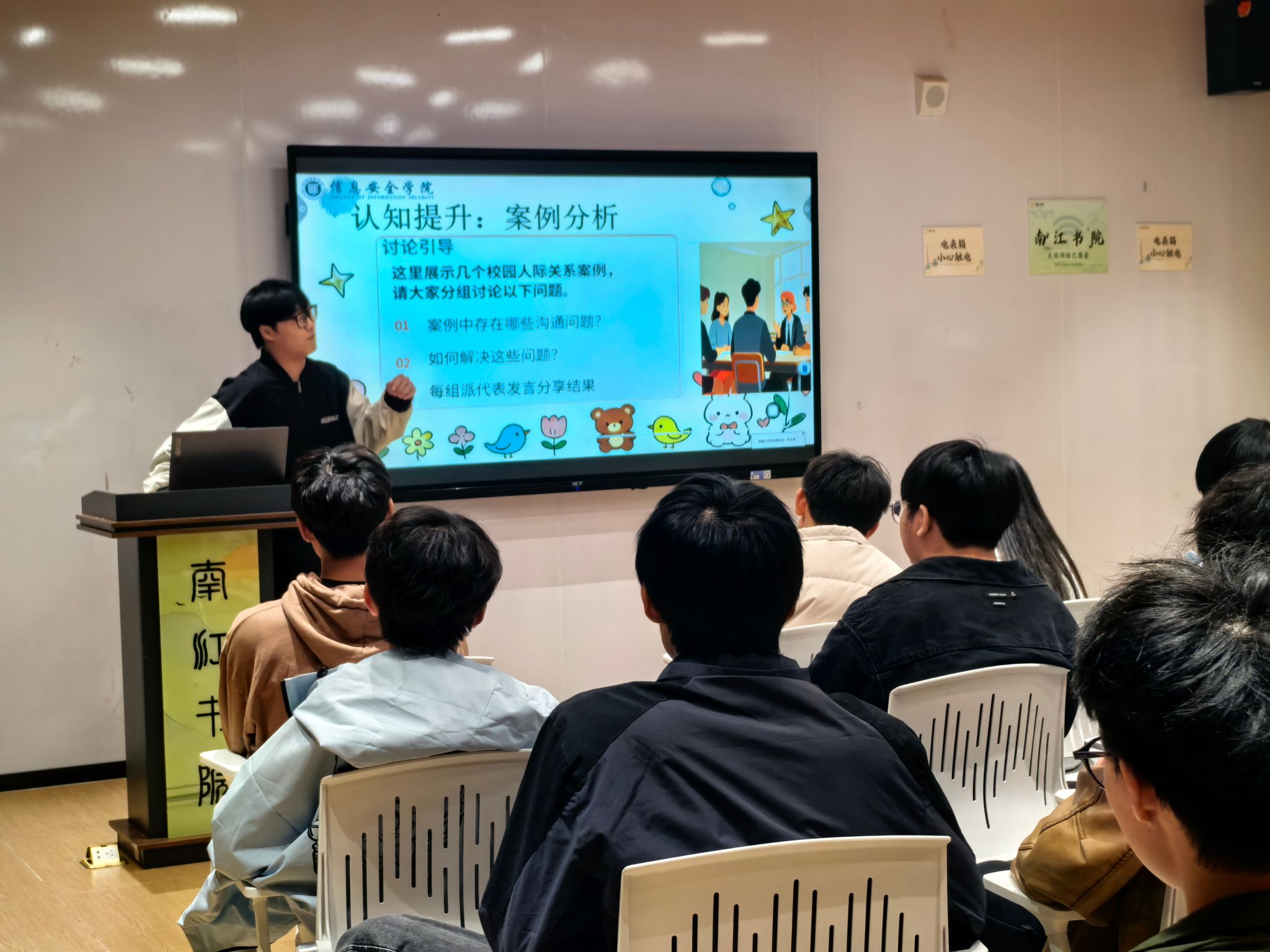 班会在轻松愉快的破冰游戏中拉开帷幕。“名字接龙+特质标签”活动迅速拉近了同学间的距离。随后,心理委员通过真实校园案例,引导同学们分组讨论沟通中常见的问题,并结合实际讲解了“积极倾听”“有效表达”等核心沟通技巧,帮助同学们构建科学的交往认知。