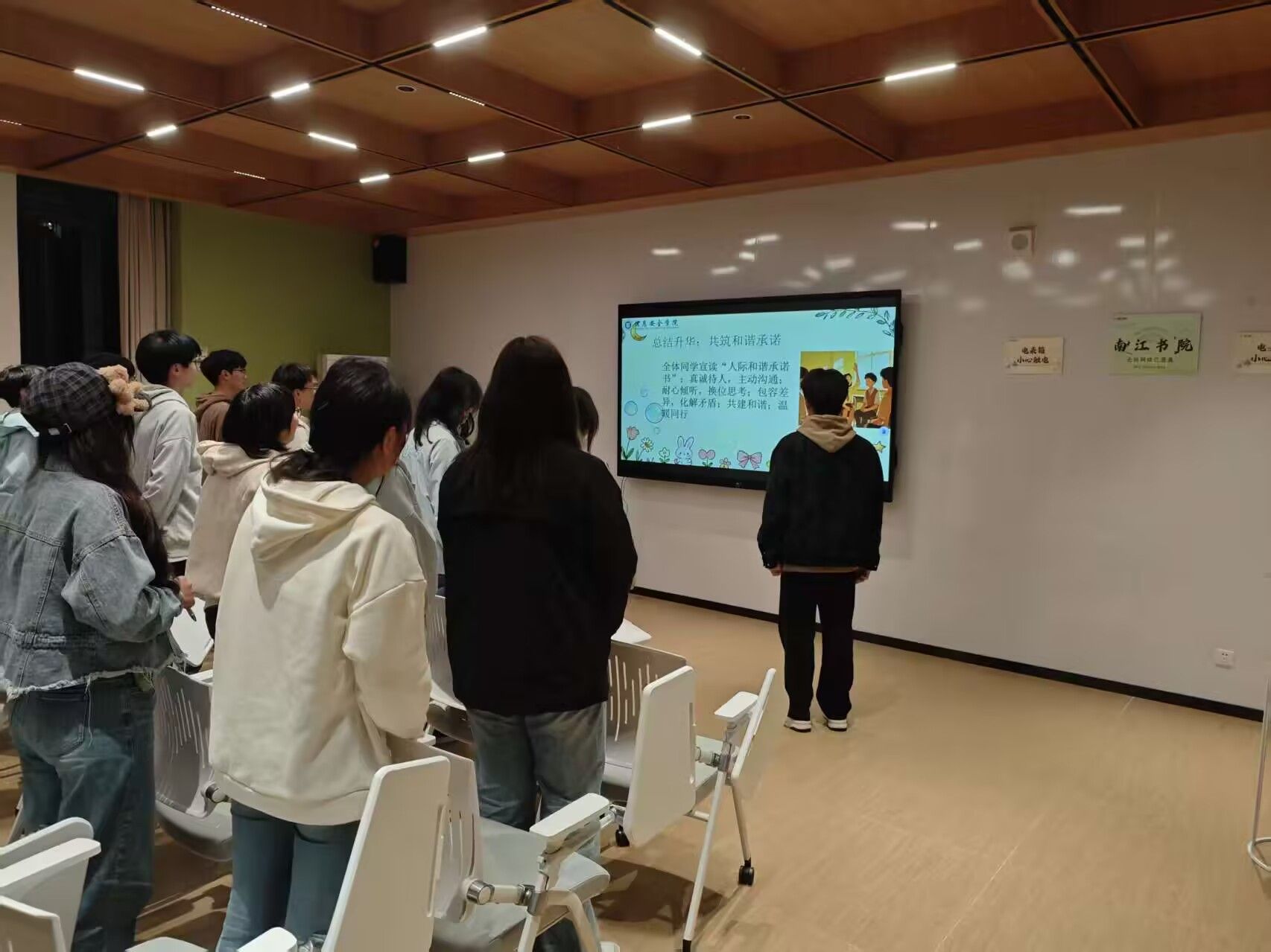 班会尾声,同学们踊跃分享收获,并在团支书带领下共同宣读了“人际和谐承诺书”,许下真诚沟通、包容共进的承诺。班长总结强调,要将所学应用于日常,主动构建温暖的人际关系。