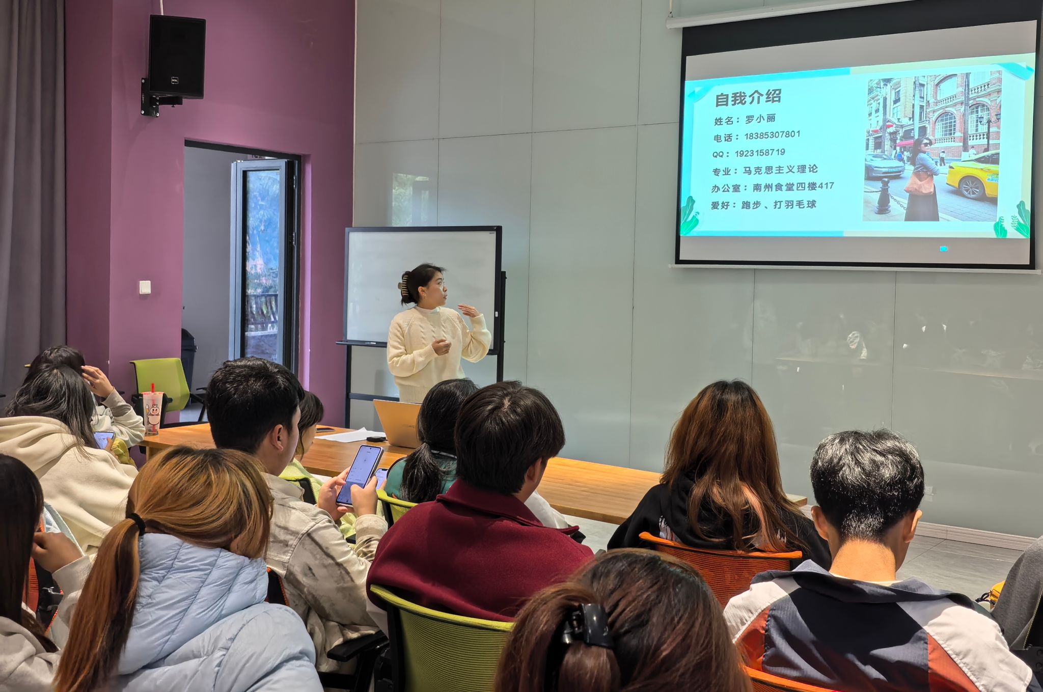 见面会伊始,罗小丽老师率先进行自我介绍。她详细分享了自己的专业背景——马克思主义理论专业的深厚积淀,让同学们对跨学科交流充满期待。同时,她公布了联系电话和QQ号,方便同学们随时沟通,并告知办公室地点,欢迎大家线下交流。罗老师还分享了跑步、打羽毛球等爱好,轻松亲切的话语迅速拉近了与同学们的距离。