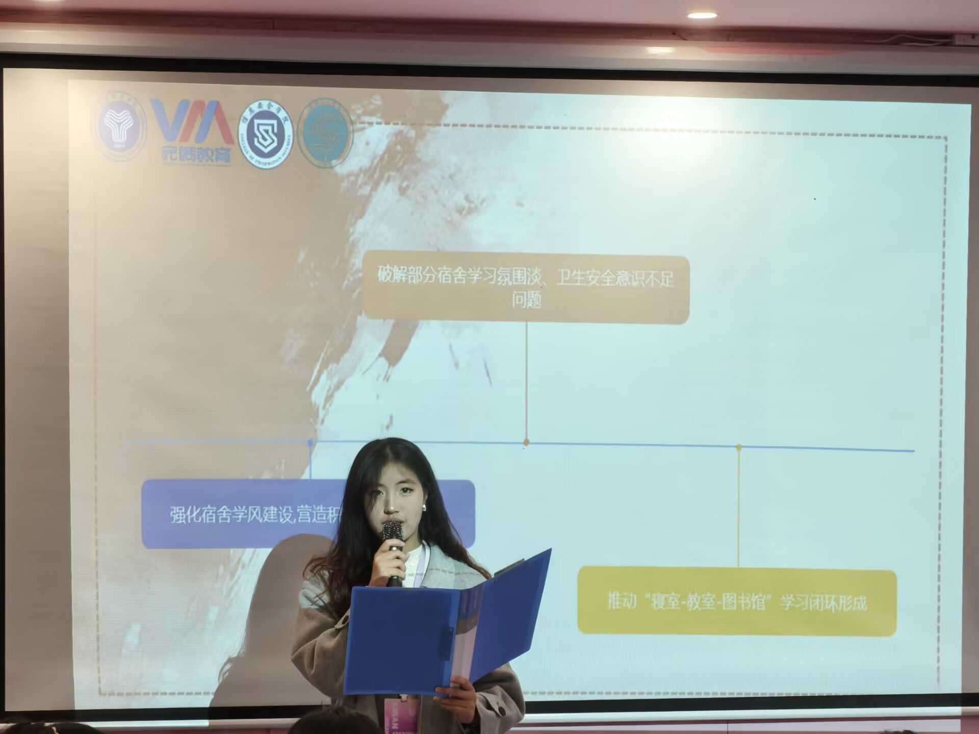 现场答辩环节,参赛队伍结合精心准备的作品,生动阐述宿舍学习氛围营造理念、日常卫生管理具体举措与特色管理方法,有的分享“分区收纳+值日轮值”的整洁秘诀,有的详解“宿舍自习打卡+互助答疑”的学风营造法,生动的分享让现场氛围愈发热烈。