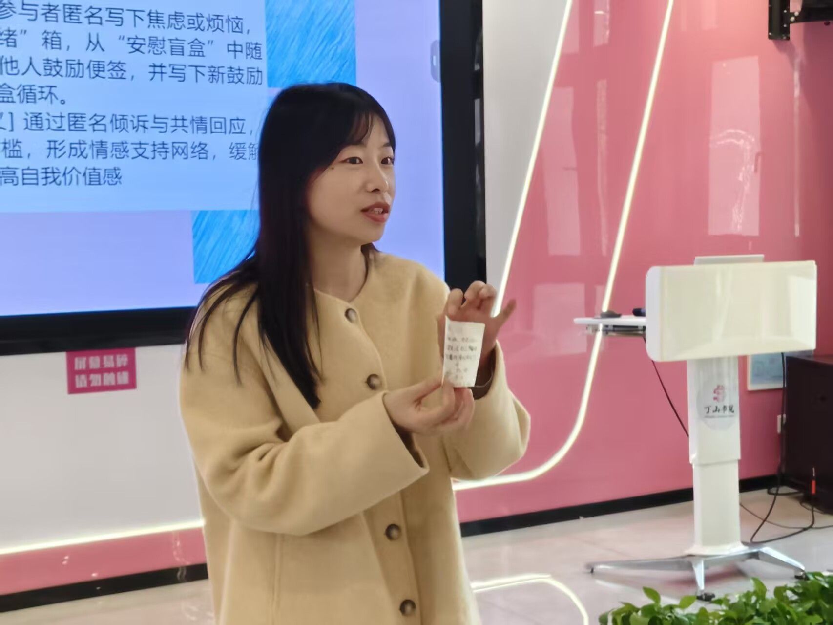 最后的环节是“情绪交换盲盒”。同学们将自己应对情绪的小妙招、温暖鼓励的话语写在卡片上,放入盲盒中随机抽取。有人抽到“难过时听喜欢的歌”,有人收获“焦虑时做三次深呼吸”,一张张卡片如同传递温暖的信使,让实用的情绪调节方法在班级中流转,也让善意与支持在同学间传递。