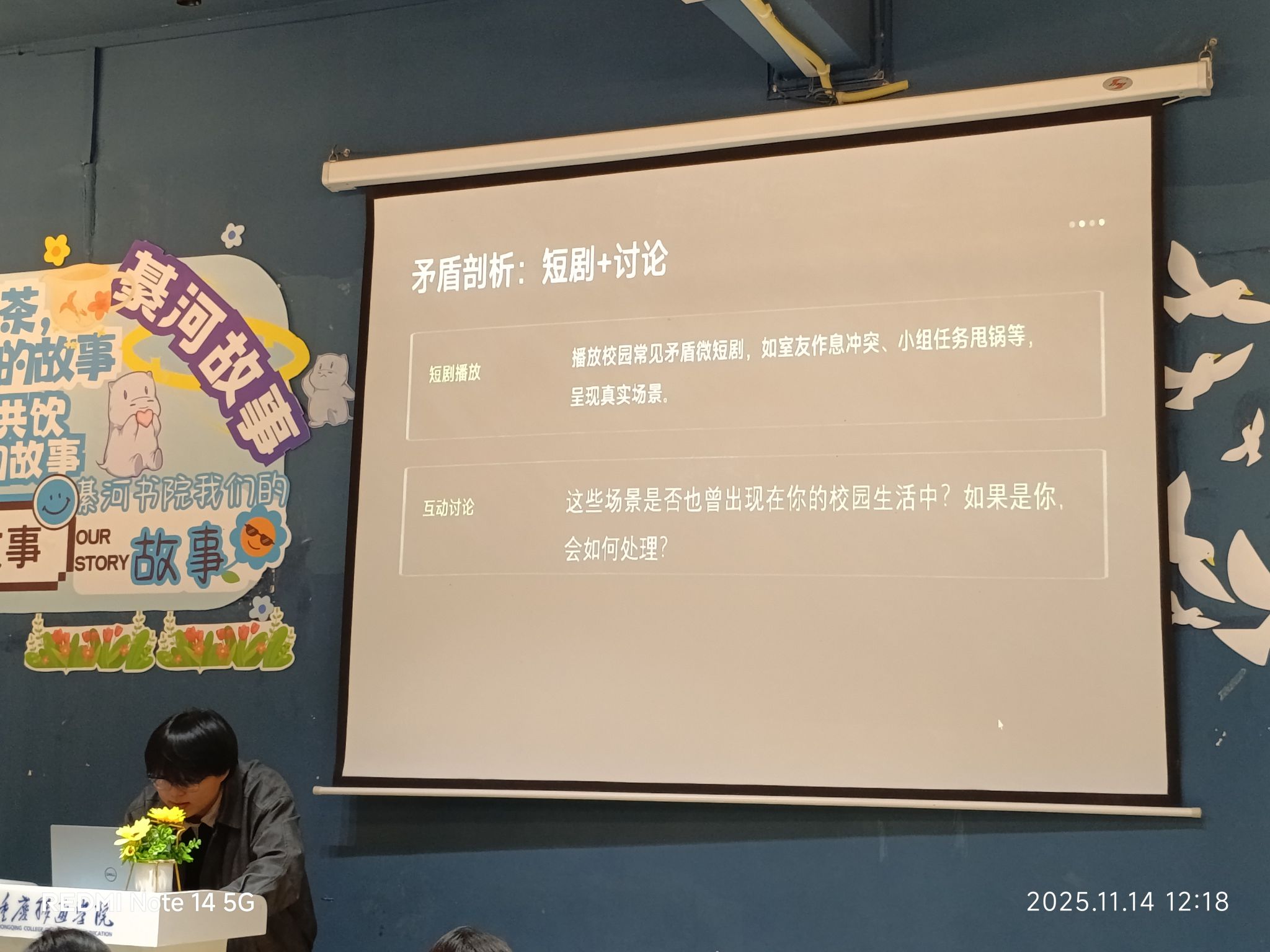 随后播放的校园人际矛盾短剧片段,真实还原了小组作业分工、宿舍作息协调等场景中的摩擦与误解,引发全场强烈共鸣。短剧落幕,同学们踊跃举手、各抒己见,围绕“如何化解矛盾”“怎样有效沟通”“怎样尊重他人边界”等话题展开热烈探讨,在思想碰撞中深化了对人际关系的认知与理解。