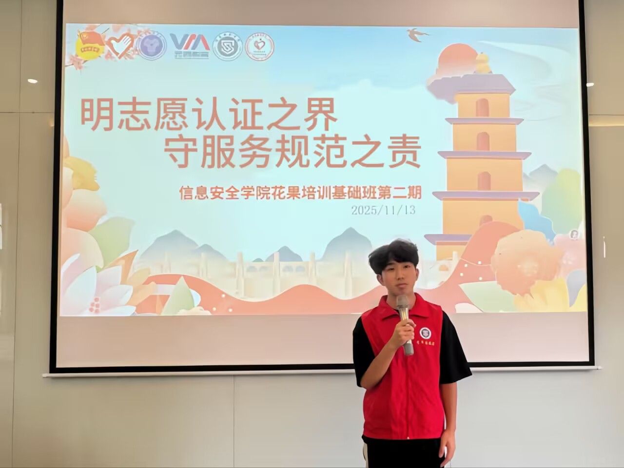 为帮助2025级学生骨干解决在志愿工作中遇到的“认证标准模糊、申报流程不清晰”等问题,让他们掌握志愿活动认证标准与流程,2025年11月13日,信息安全学院团总支青年志愿者协会在观云书院冬至·多媒体教室开展“明志愿认证之界·守服务规范之责”花果培训基础班第二期活动。