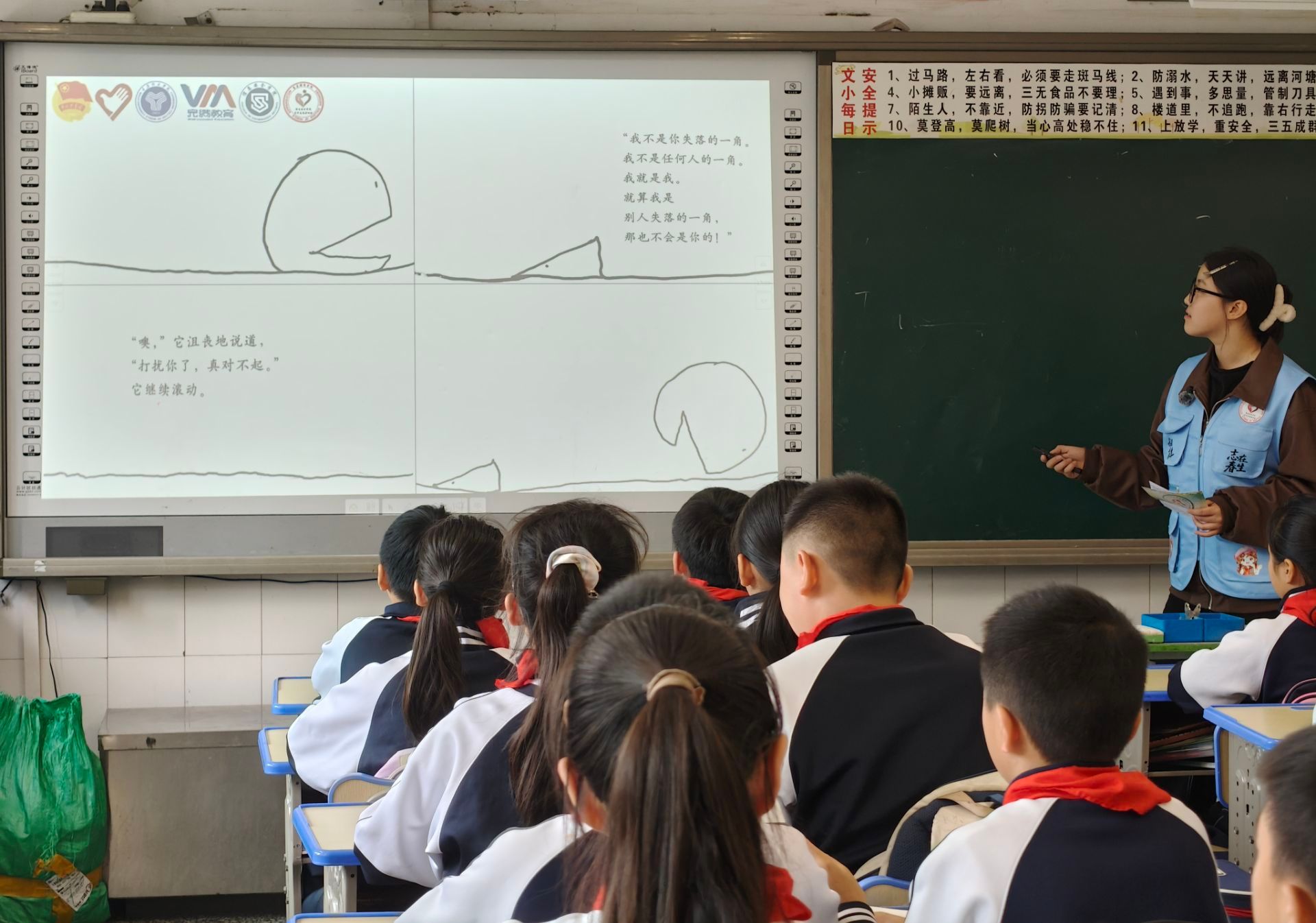在共读《失落的一角》时,志愿者耐心引导孩子们思考:“我们是否也像那个执着追求的圆?”孩子们在故事里共情、在讨论中碰撞,慢慢懂得:生命的圆满不在于完美无缺,而在于与不完美的自己相拥。