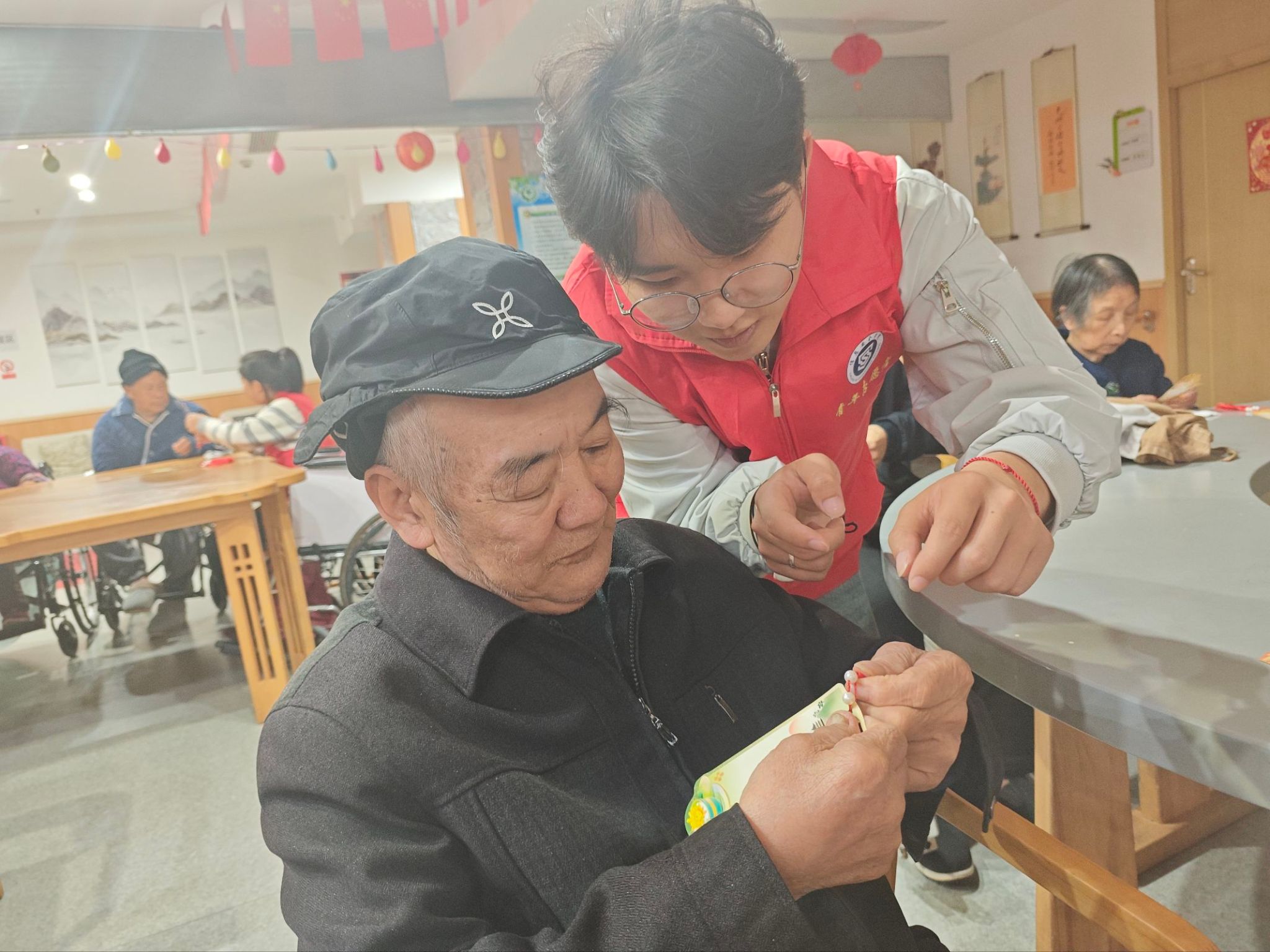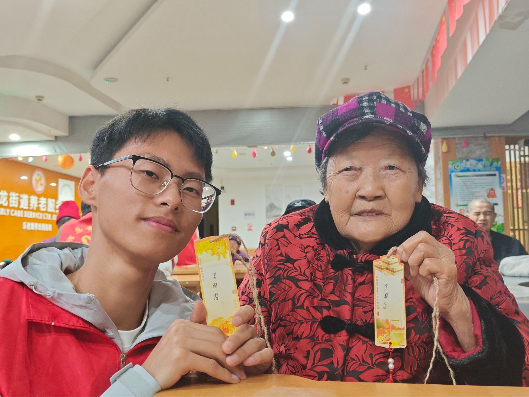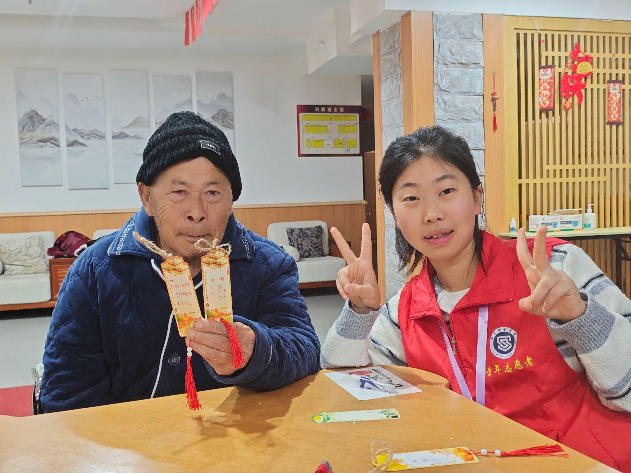 在志愿者的帮助下,老人们一步步完成了书签的制作。虽然双手已不复年轻时的灵巧,但每完成一个步骤,他们眼中闪烁的光芒与唇角扬起的弧度,都让时光仿佛倒流回意气风发的年华。这份由指尖传递的温暖,这份跨越年龄的真诚互动,已成为老人和志愿者心中永不褪色的珍贵记忆。