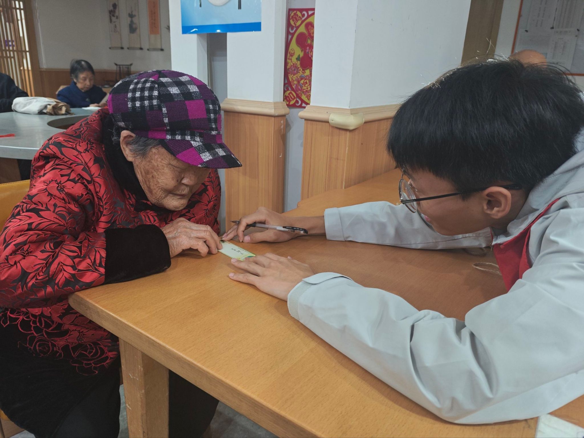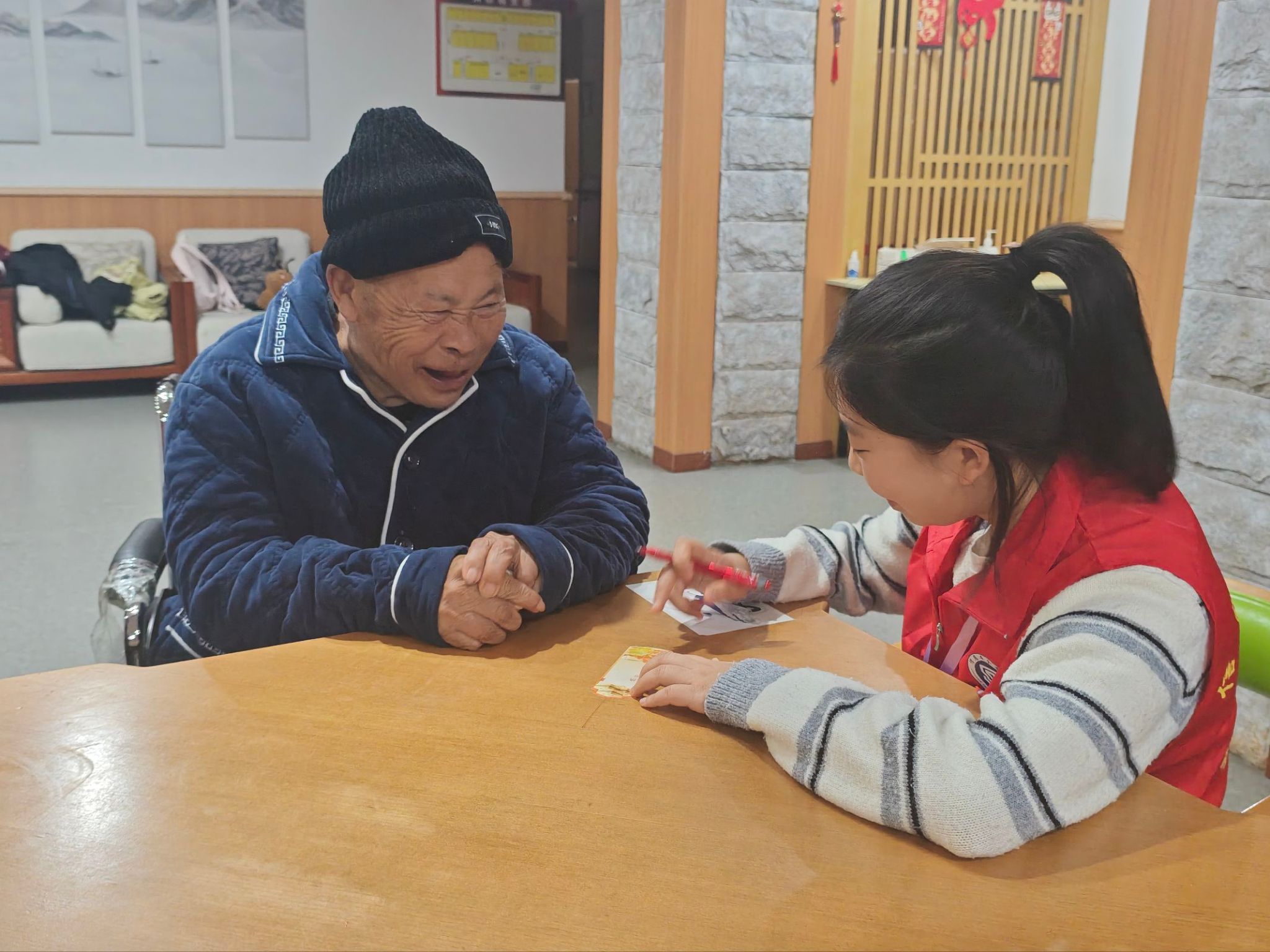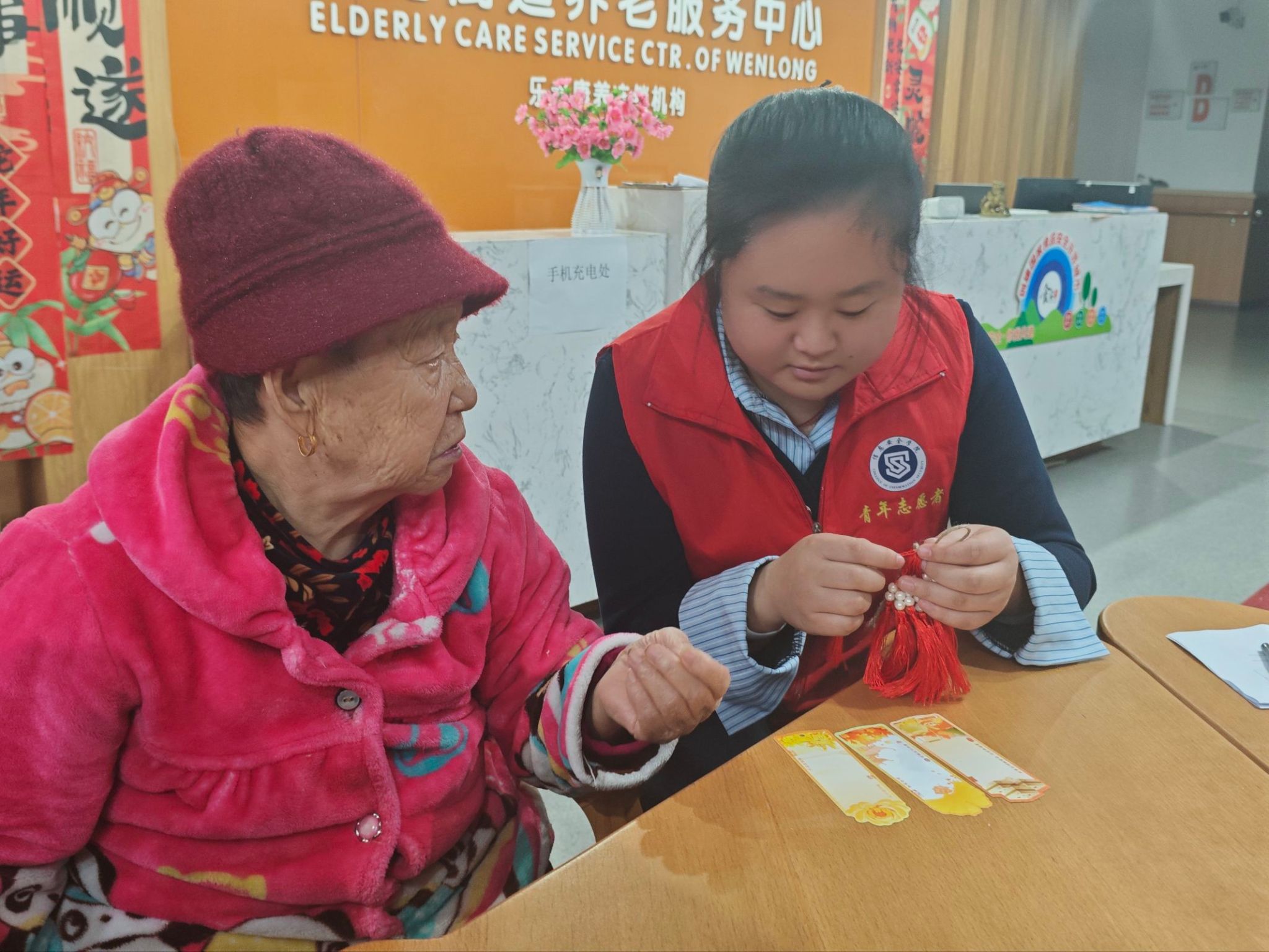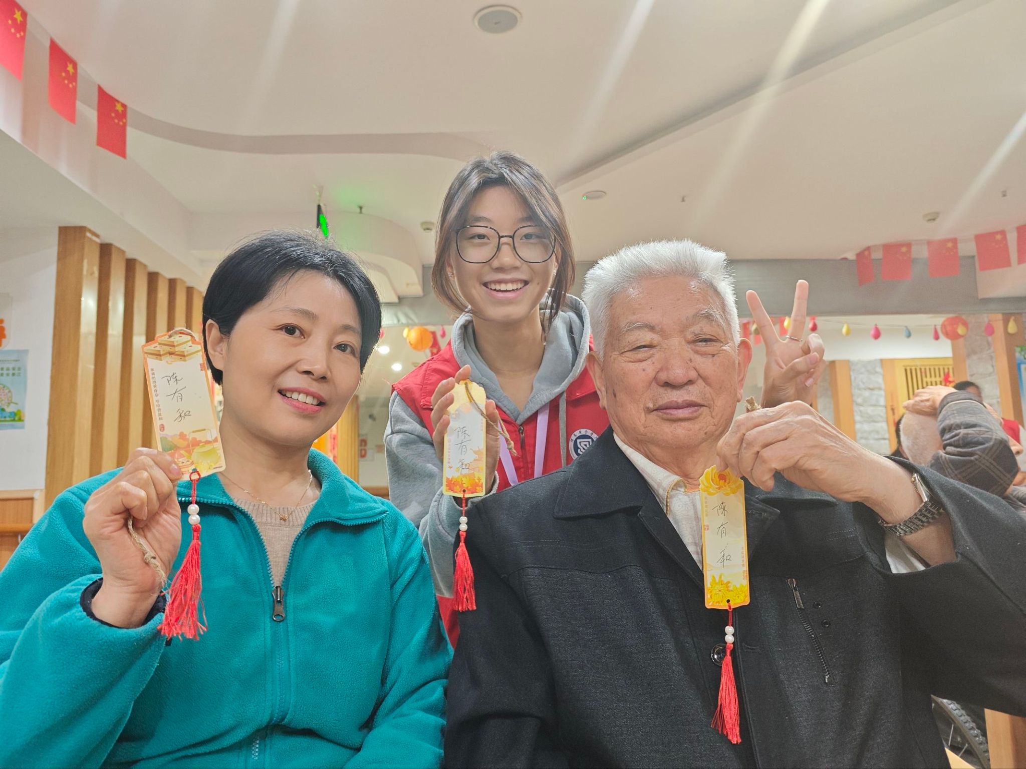 在志愿者的帮助下,老人们一步步完成了书签的制作。虽然双手已不复年轻时的灵巧,但每完成一个步骤,他们眼中闪烁的光芒与唇角扬起的弧度,都让时光仿佛倒流回意气风发的年华。这份由指尖传递的温暖,这份跨越年龄的真诚互动,已成为老人和志愿者心中永不褪色的珍贵记忆。